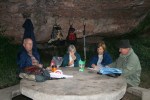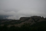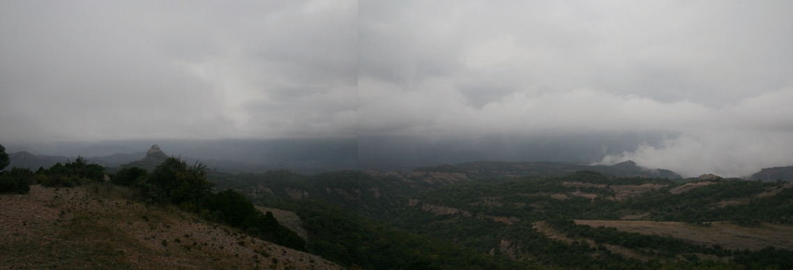Però, si alguna cosa caracteritza, als Rotaris és el seu esperit de superació i els pocs que hem desafiat el temps (5 valents) hem decidit que valia la pena provar de fer l’excursió prevista. A l’arribar a l’Alzina del Salari la pluja era més intensa i hem decidit esperar una estona per veure si anava a més o parava. Finalment ens hem decidit i amb roba impermeable ja ens tens camí amunt, cap al coll de Tres Creus. Podeu comprovar en les fotos el cel tant tapat que teníem damunt dels caps. Del coll hem baixat cap a la Font de la Pola i hi hem esmorzat aixoplugats sota la Balma.