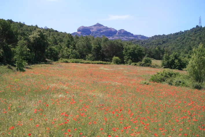 Tornant una mica enrere travessem el rierol i tornem a trobar cel camí carreter que havíem deixat just davant del pantà. El camí va seguint el rierol i ens porta fins arribar a una carretera que seguirem a mà esquerra fins trobar un nou torrent. Cal travessar un pont i seguir el camí que pel Torrent de la Vall torna en direcció cap on em deixat el cotxe. Aquesta vall és especialment bonica ja que ens acompanyarà la vista del Montcau i la Falconera, a més d’uns camps de roselles que fan del la passejada una delícia. El camí no té cap dificultat i ens portarà sense problemes de nou a la casa de la Vall on hi havíem deixat el cotxe.