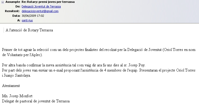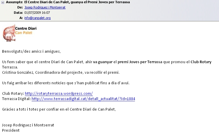 Hem rebut alguns mails d’agraïment per part de les entitats participants en el XIII Premi Joves per Terrassa que aquí us reproduïm: