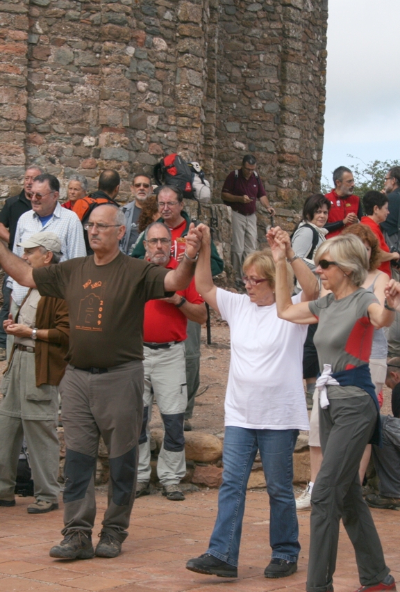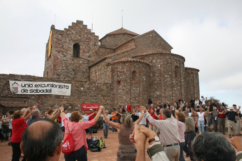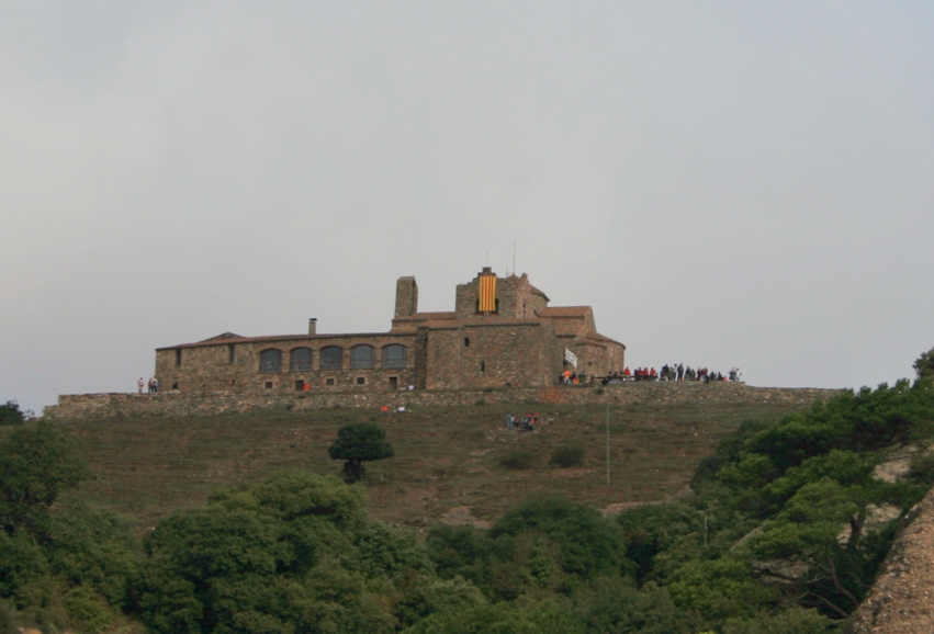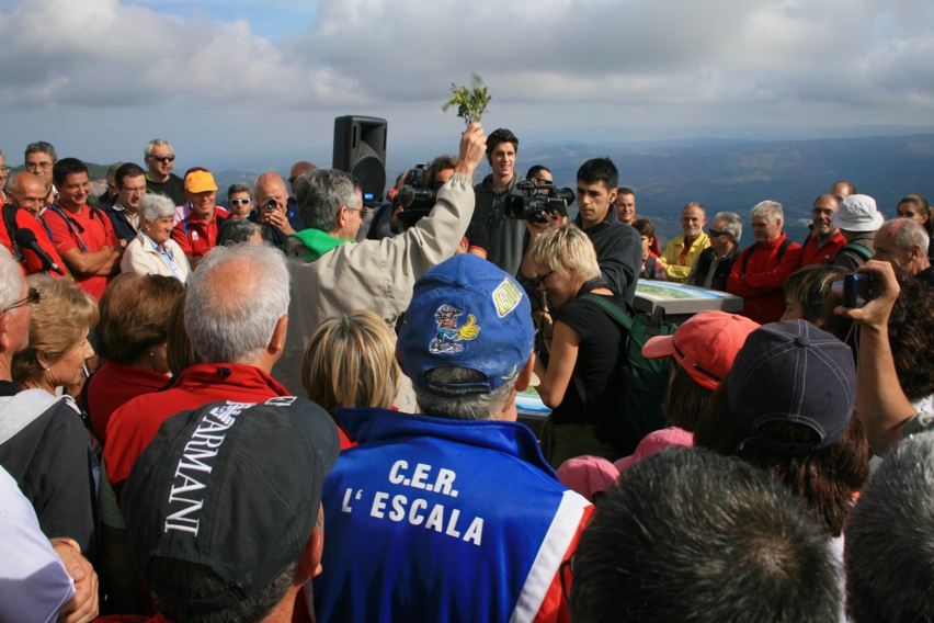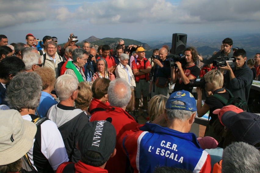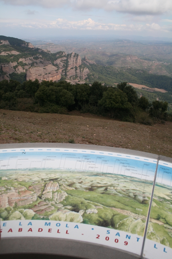 Hi hem anat pel camí dels monjos i era molt bonic anar veient durant la pujada, l’edifici del monestir engalanat amb una gran senyera. A les 11 ja érem a dalt, just a l’hora en que es va fer la benedicció i posterior inauguració de la magnifica taula d’orientació que l’obra social de Caixa Sabadell ha fet construir per celebrar el seu 150 aniversari. La taula és molt gran, fa tres metres de diàmetre i els detalls són molt precisos i com podreu veure en una de les fotografies els dibuixos mostren perfectament l’orografia que es pot veure des del cim de la Mola.