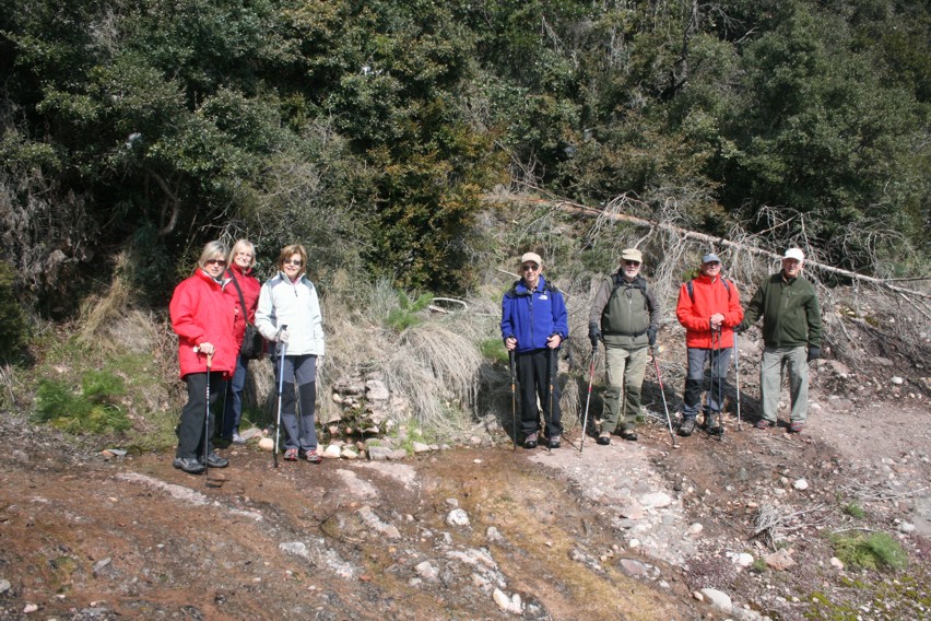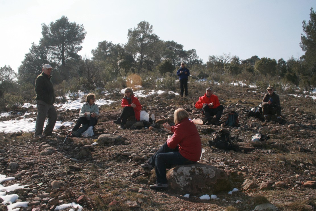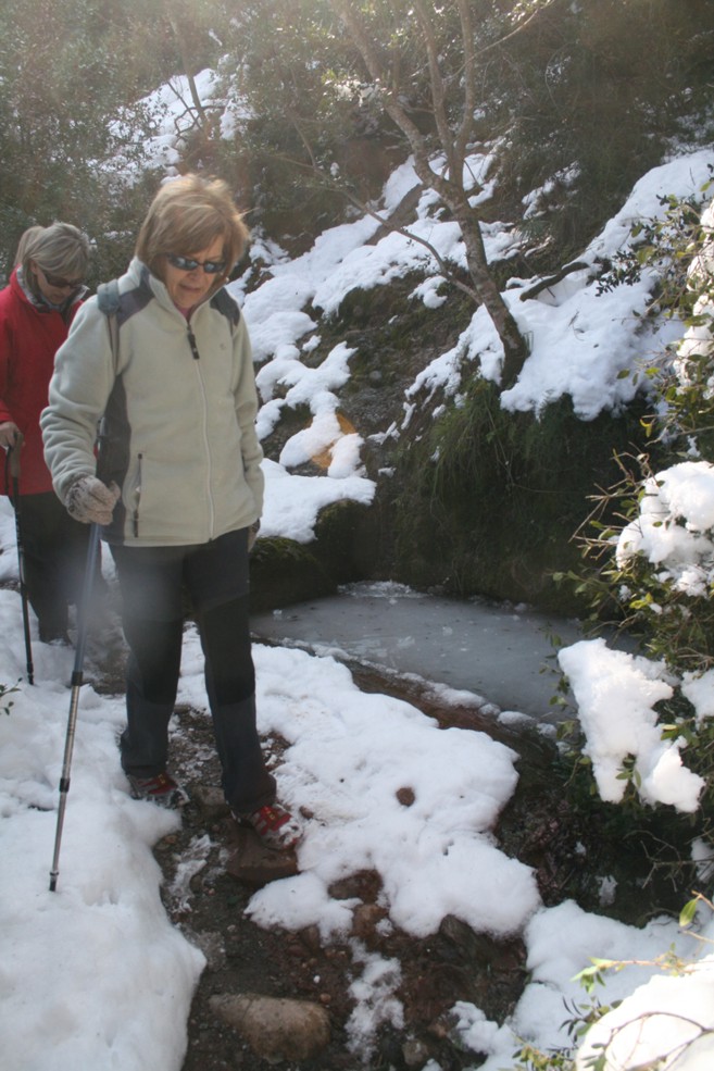 En aquest mirador, net de neu, hem esmorzat i desprès em retornat enrera, de nou fins al Coll de Grua, on hem agafat el trencall que es troba a la dreta i que et porta planejant fins l’anomenat Gorg del General, una mena de bassa (avui ben glaçada) on s’hi abeuraven els animals que feien la ruta de Matadepera a Sant Llorenç Savall que és on hi havia els molins (d’aquí li bé el nom de camí Moliner).