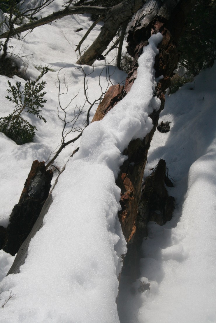 Seguint pel camí, força ple de neu i amb moltes branques esquinçades i trencades pel pes de la neu, hem arribat a la Font de les Mosques, una petita bassa que normalment està seca però que aquests dies degut a les pluges i la neu estava ben plena. Si us hi fixeu hi veureu el nom escrit al fons de la bassa en una pedra.