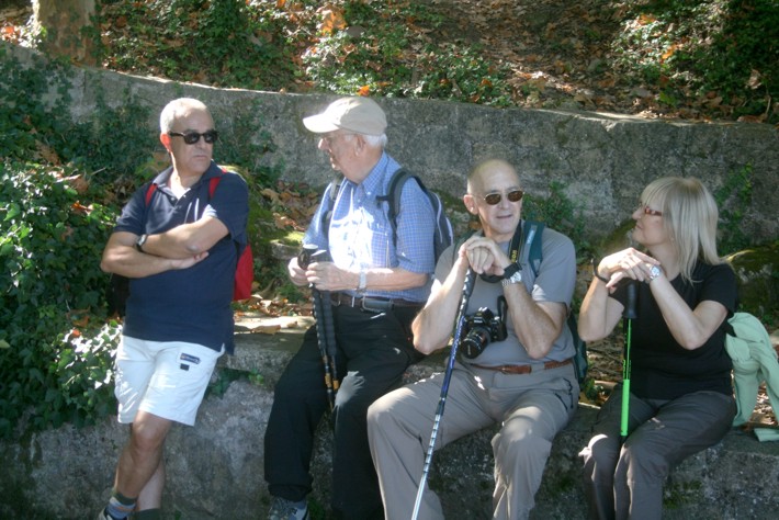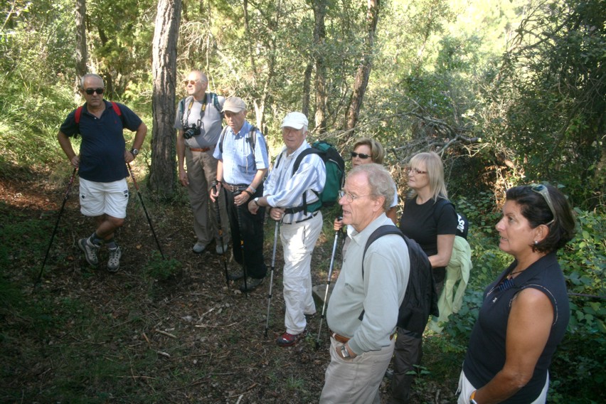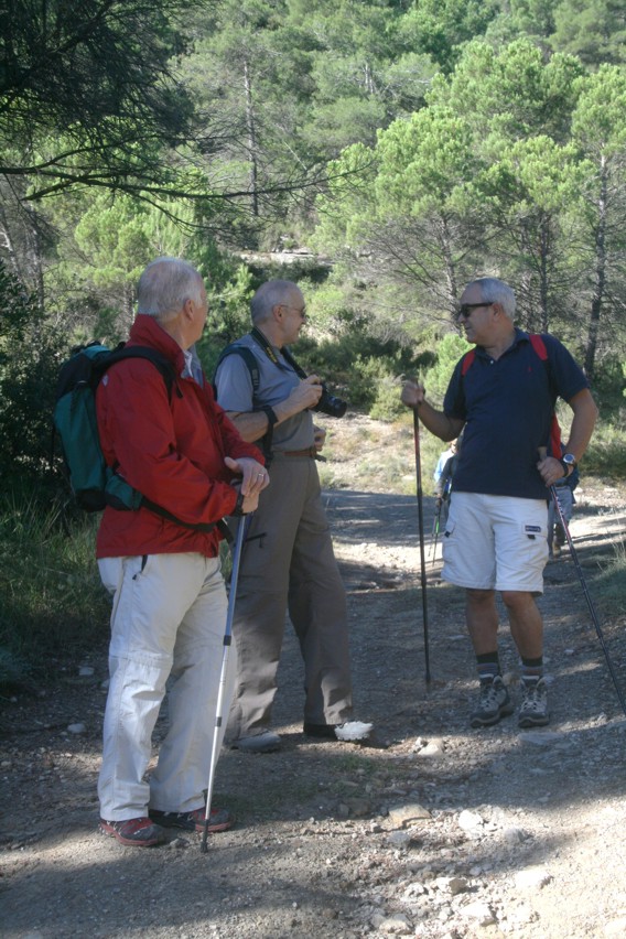 Agafem un camí cimentat que inicia una suau baixada entre el bosc per una zona d’antics bancals de vinyes. Passem pel costat d’antigues casetes de pastor de pedra seca molt ben conservades i seguim baixant fins a la