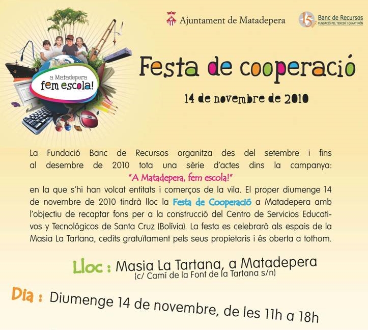 La Fundació Banc de Recursos organitza el dia 14 de novembre la “Festa de cooperació” amb l’objectiu de captar recursos pel projecte de construcció del Centre de serveis educatius i tecnològics de Santa Cruz a Bolívia.