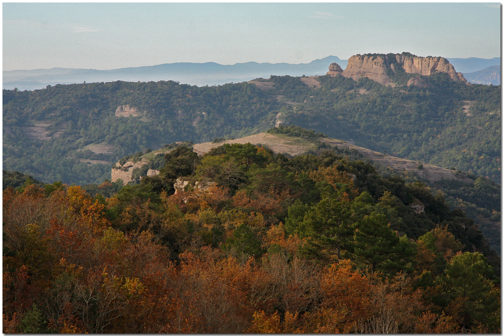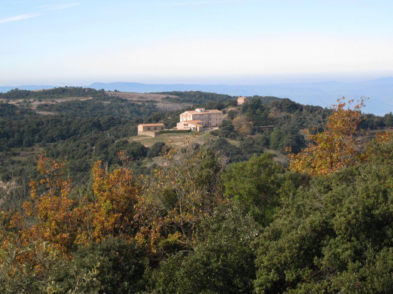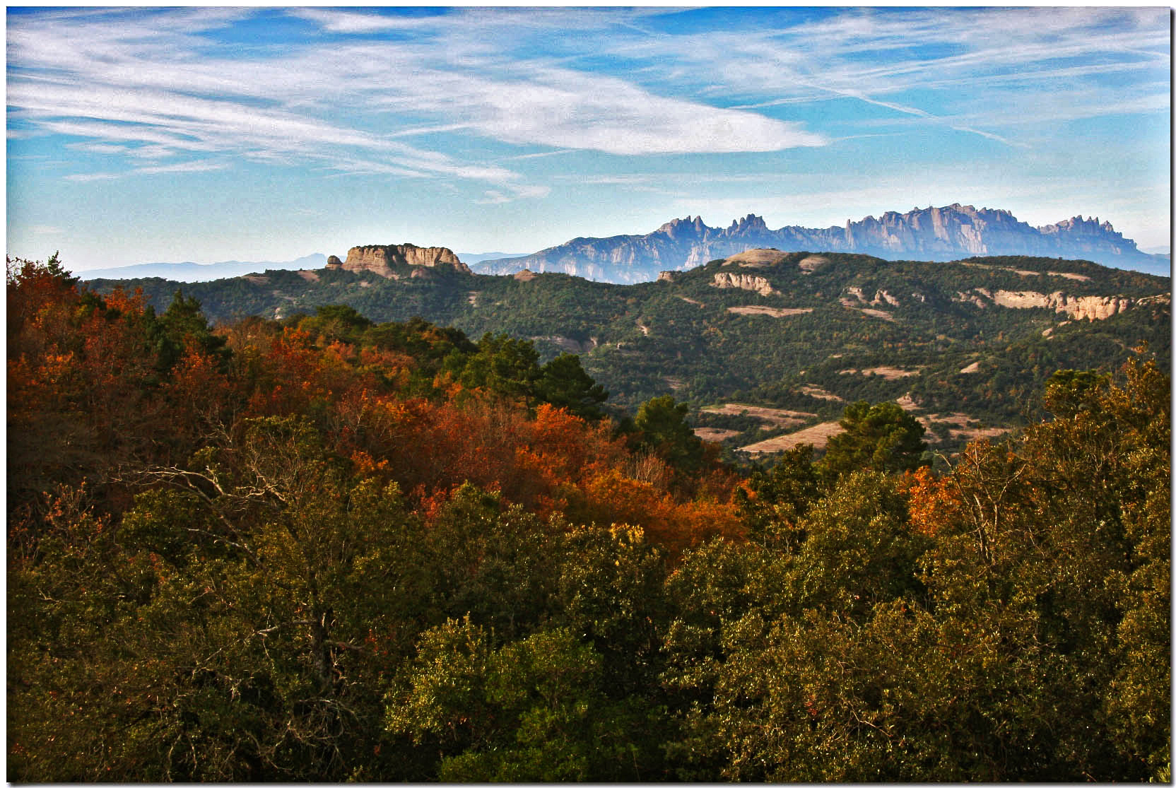 Aquí les vistes són molt boniques i a part de veure la vessant del Montcau s’albira també la serralada de Montserrat i a sota nostre la roureda del Sot de la Bota tota pintada de colors de tardor.