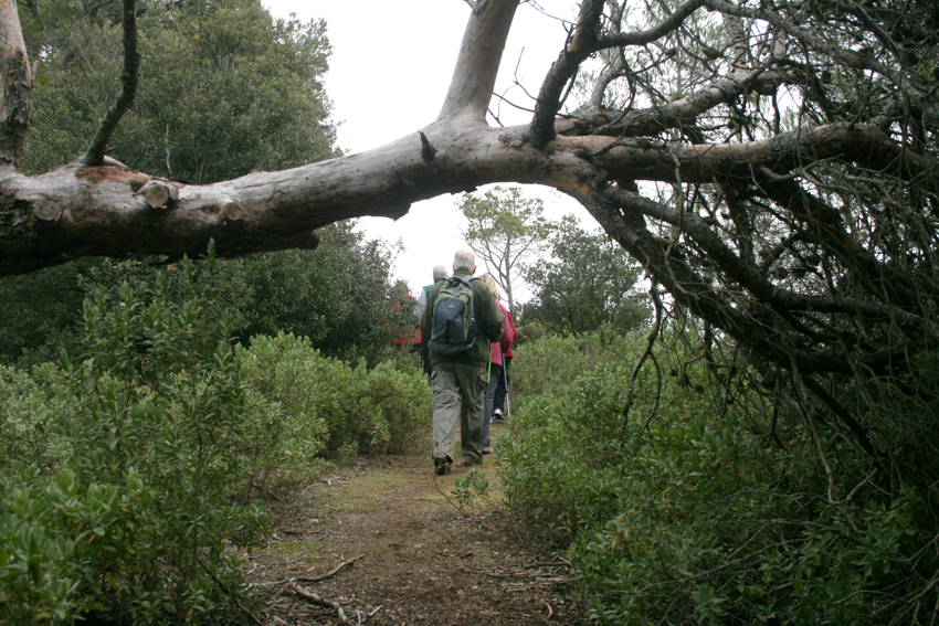 Optativament ara podríem pujar fins a Roca Mur per una caminet que es troba a mà esquerra, però nosaltres un cop tips seguim per camí que trobem just com a continuació del que ens ha portat fins el coll i que passant per l’anomenat Puig Gavatx iniciarà una baixada per uns estepars en direcció a la Roca de l’Àliga que quedarà just davant nostre. El camí ens porta fins a