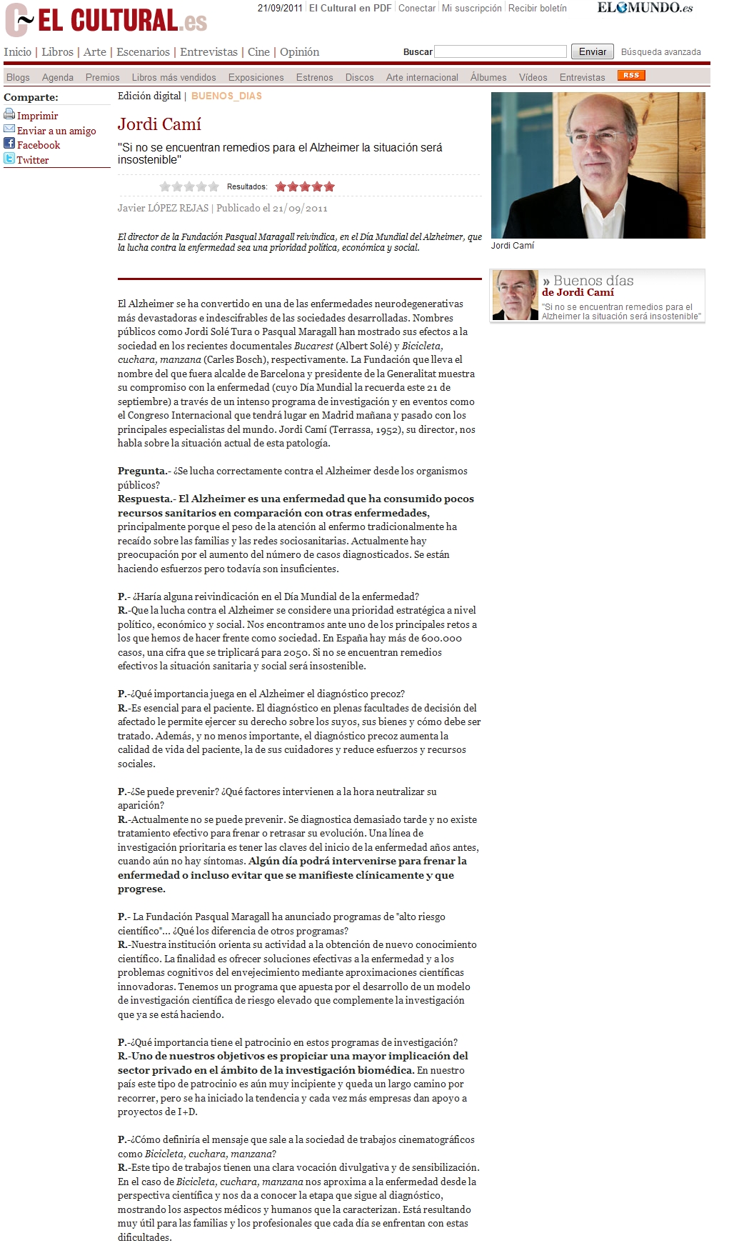 També us volem convidar a llegir l’article que avui s’ha publicat a El Periodico y una entrevista al doctor Jordi Camí a El Cultural.es, director de la Fundació Pasqual Maragall.