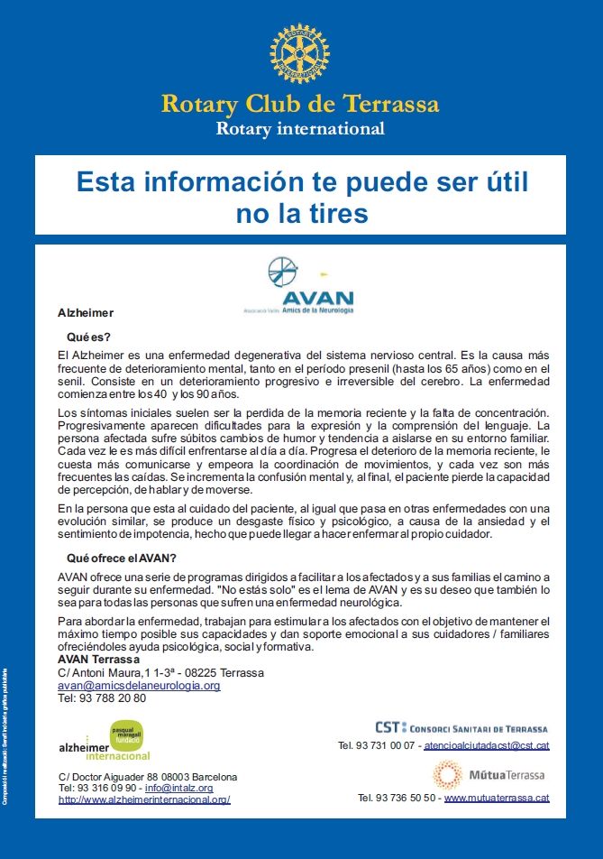 Des del Rotary Club de Terrassa volem recordar els consells que vàrem elaborar conjuntament amb l’AVAN sobre l’Alzheimer.