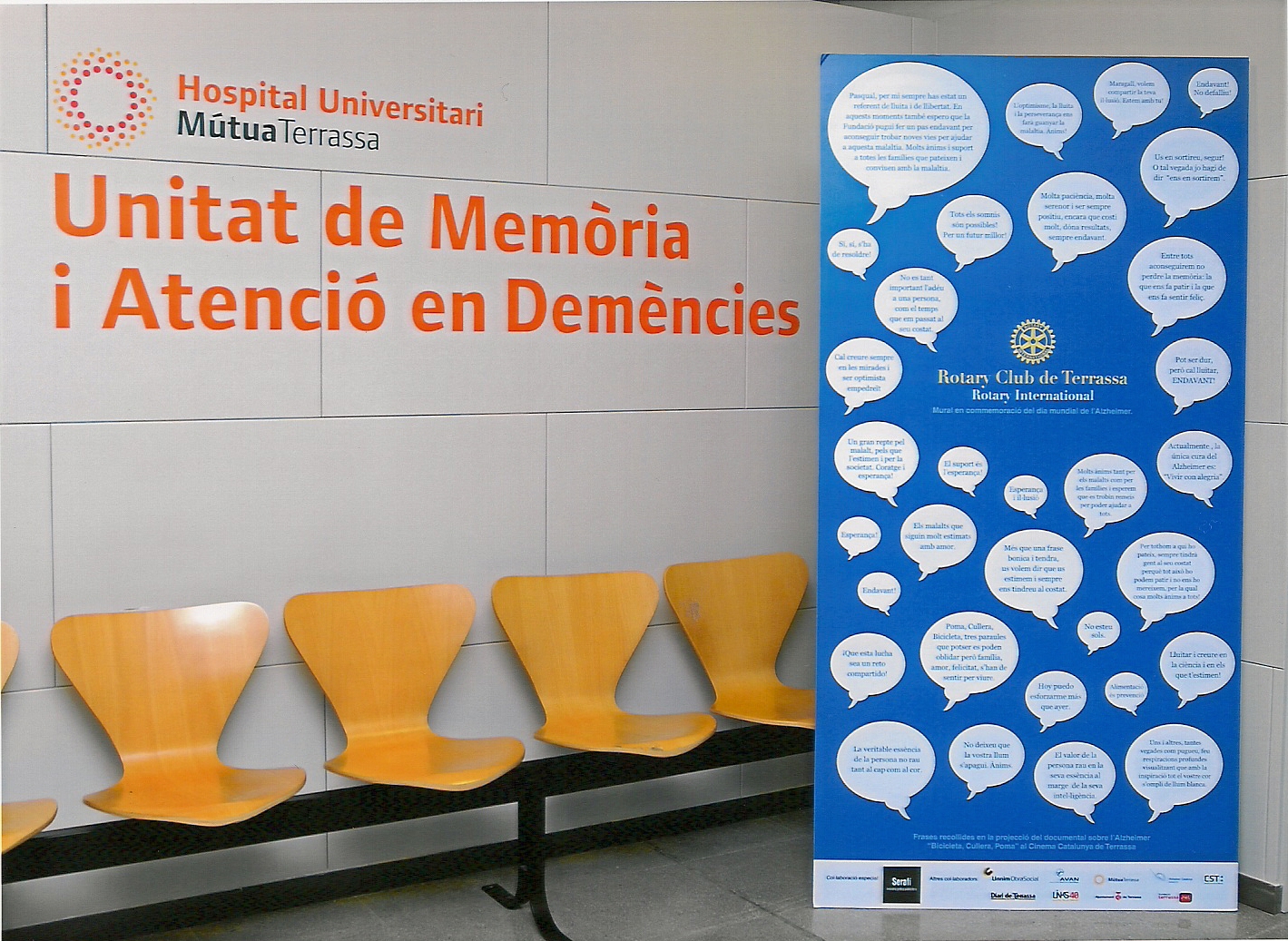 El Rotary Club de Terrassa durant la projecció de la pel·lícula “Bicicleta, cullera, poma” que es va fer en el cinema Catalunya, va demanar vals assistents que col·laboressin amb frases de recolzament als familiars i malalts de l’Alzheimer i desprès de reunir les aportacions rebudes ha confeccionat uns pannells informatius que ha volgut donar a conèixer a la resta de la població gràcies a l’acord amb els dos centres hospitalaris de la ciutat.