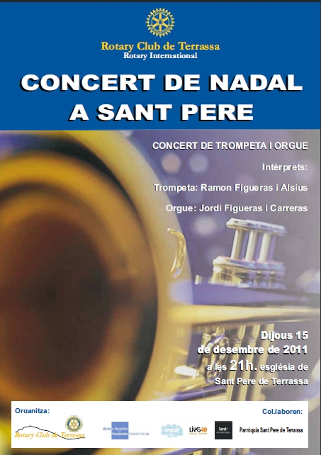 Us esperem al tradicional Concert de Nadal, que com cada any ens oferirà el nostre company i organista Jordi Figueras, aquest any acompanyat a la trompeta per en Ramon Figueras, el proper dijous 15 de desembre a les 9 del vespre a l’església de Sant Pere. El concert és obert a tota la ciutadania.