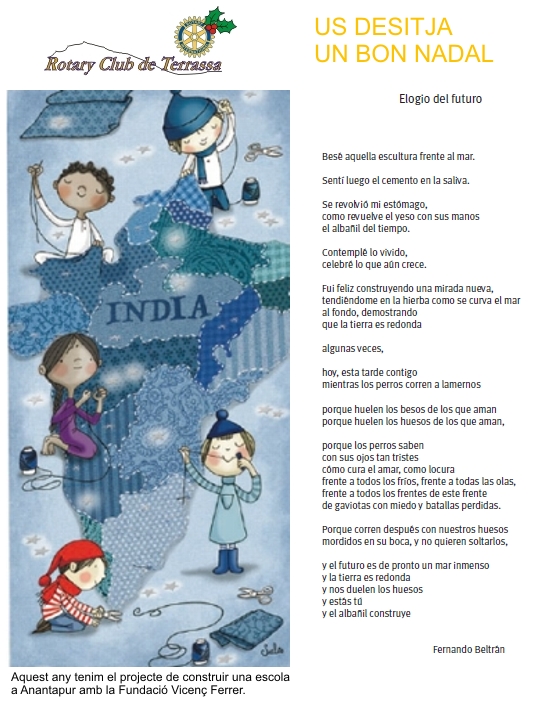 Us volem desitjar un Bon Nadal i un millor 2012 amb la nostra felicitació de Nadal d’aquest any, en la que trobareu representat el mapa de la Índia en referència al projecte que tenim per la construcció d’una escola a Anantapur, conjuntament amb la Fundació Vicenç Ferrer i la Fundació Rotary International.