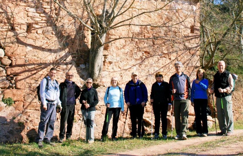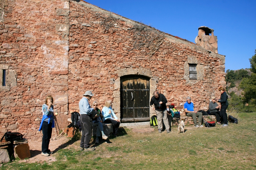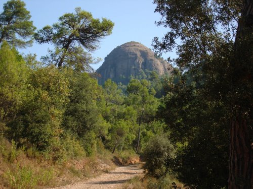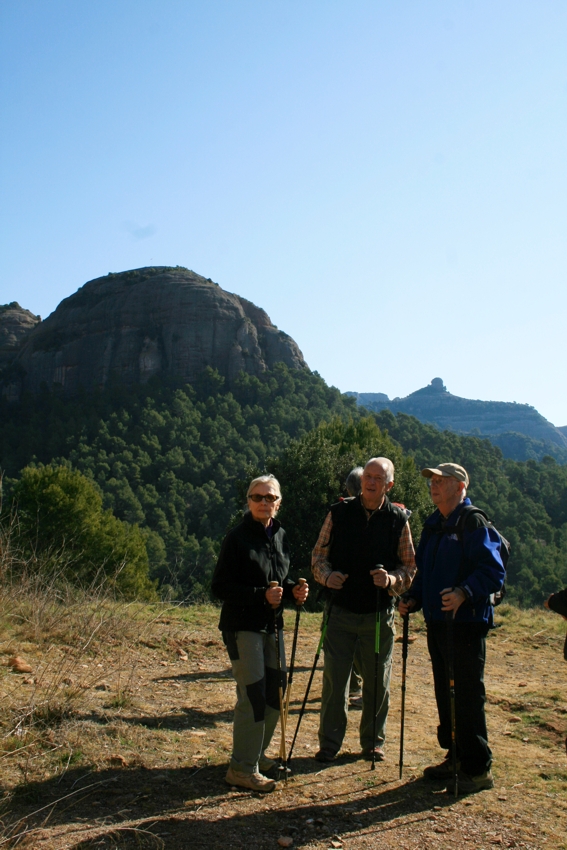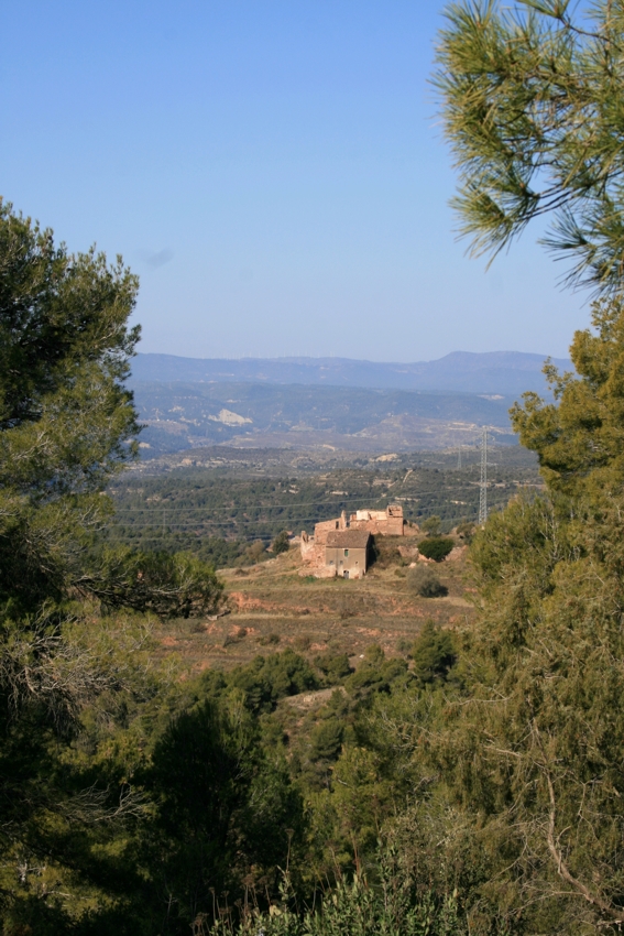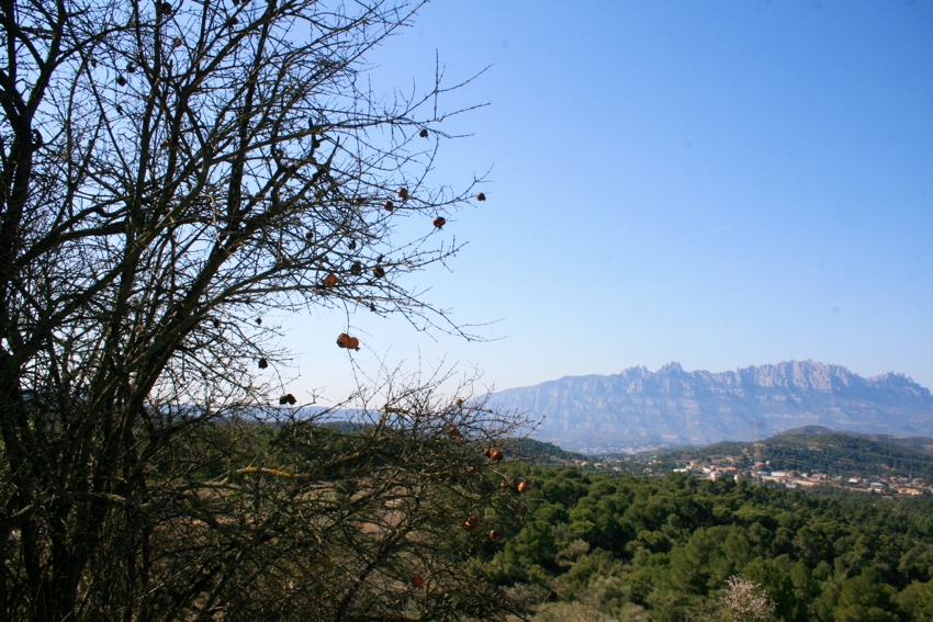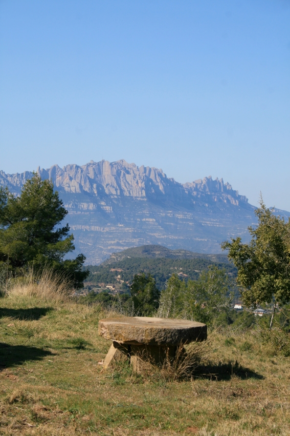El camí rodeja la casa i sortim al costat de les runes d’una antiga construcció que deixem a la nostra dreta. Seguim pujant i arribem a una altra masia amb unes vistes espectaculars, a un cantó del castell de Bocs i el Paller de tot l’any i per l’altra de Montserrat. Aquí parem i esmorzem.