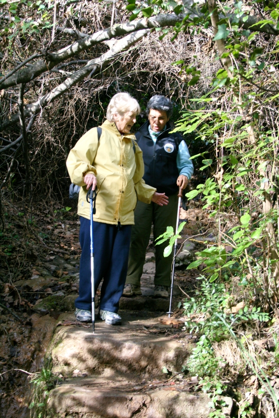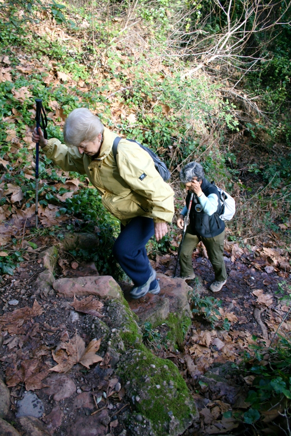 La font rajava com sempre i com que està en un lloc molt humit no ens hi hem aturat massa i retornant unes passes enrera pel mateix camí que du a la font hem agafat ara a mà esquerra un camí senyalitzat que indica la direcció de Coll d’Eres. Al començament puja fort per una zona acanalada on s’hi ha fet escales a la pedra per facilitar-ne el pas. A mitja pujada hem arribat a una clariana amb un mirador que ens ha premés veure per primera vegada el sol en la sortida. Des d’aquest moment el dia ha fet un tomb i a més del sol el cel s’ha aclarit i ha quedat d’un blau ben intens.