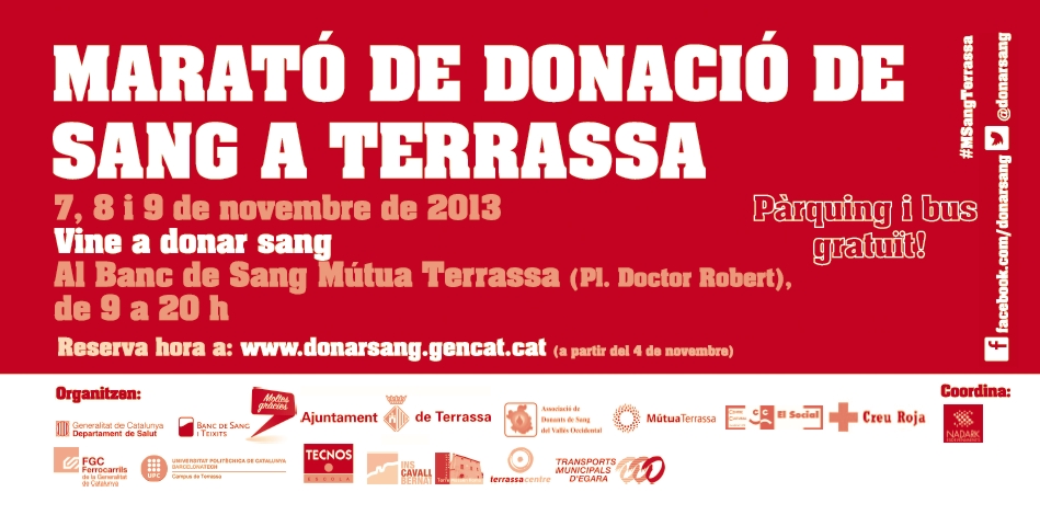 Aquest dissabte 9 de novembre tindrà lloc a Terrassa la Marató de Donació de Sang que cada any organitza el Banc de Sang i Teixits de la Mútua de Terrassa conjuntament amb d’altres entitats, entre les que aquest any hi participarà de nou el Rotary Club de Terrassa i alguns joves del Rotaract Vallès.