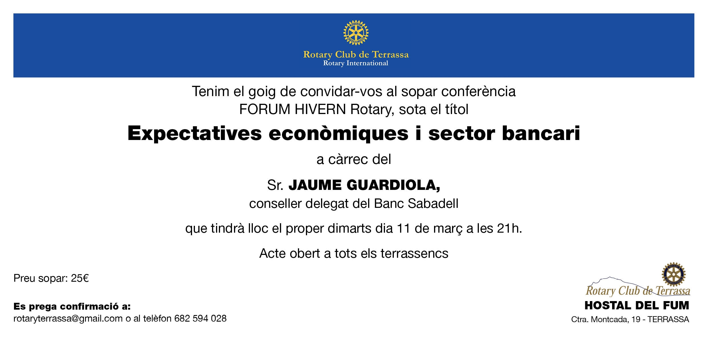 En un acte obert a tots els terrassencs, el proper dimarts dia 11de març el Rotary Club de Terrassa organitzarà un sopar Fòrum, amb el Sr. Jaume Guardiola sota el títol: Expectatives Econòmiques i sector bancari.