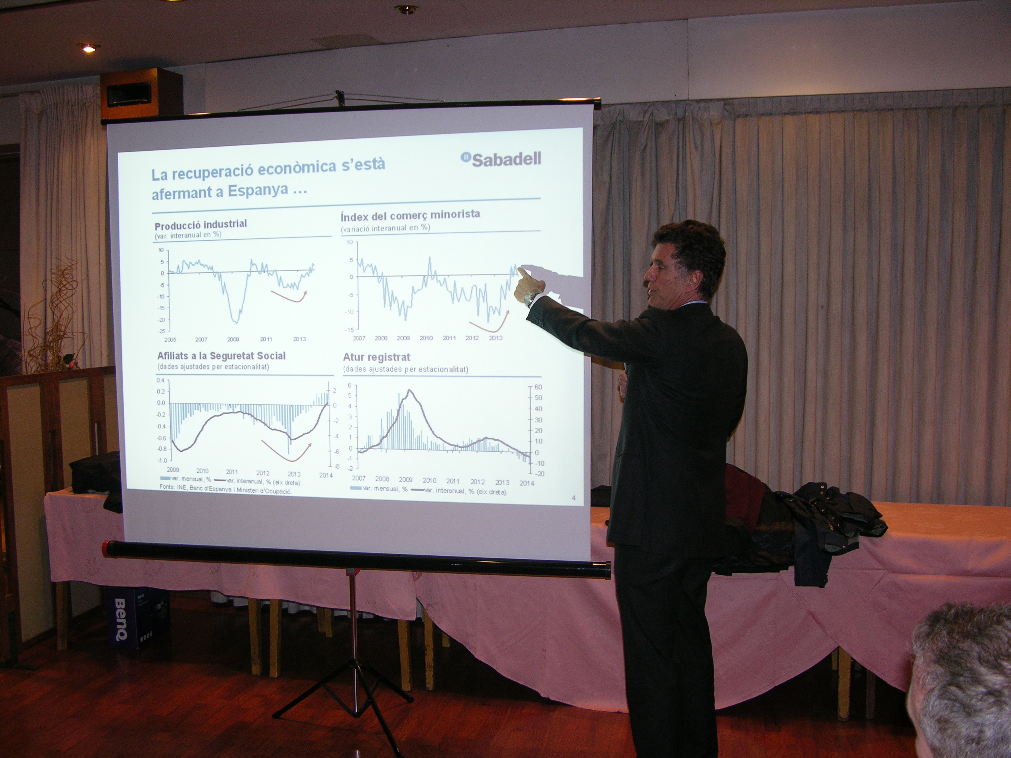 El senyor Jaume Guardiola, Conseller Delegat de Banc Sabadell, va començar la conferència en el context del Fòrum organitzat per el Rotary Club de Terrassa, parlant de les perspectives econòmiques per a l’any 2014. Segons el seu punt de vista la recuperació econòmica s’està afermant a Espanya, tal com reflecteixen diferents indicadors de l’activitat, fonamentada en un context financer més favorable. Per a ell la fase aguda de correcció dels desequilibris ha quedat enrere, malgrat que encara persisteixen factors negatius. La millora de l’activitat fa pensar que tindrà continuïtat a partir d’ara.