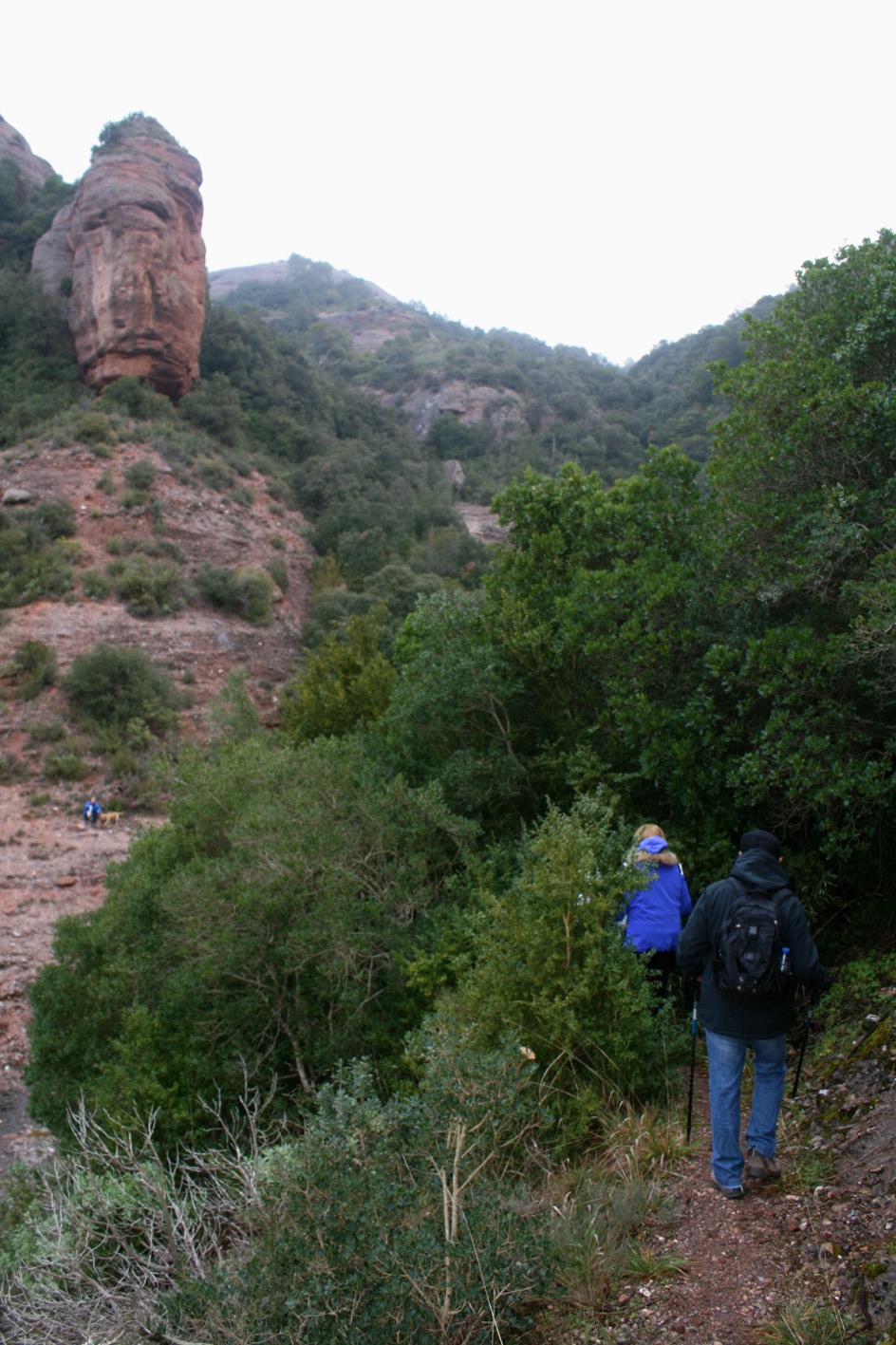 Un cop al coll trobarem un caminet a l’esquerra que porta a la Roca Salvatge i un a l’esquerra que seguirem i que giravoltarà desprès cap a l’esquerra i que acaba portant-nos a dalt de la carena, fins arribar al camí ral de Manresa. Aquí hem agafat el camí ral a mà esquerra i unes poques passes més endavant ja hem agafat un camí que baixa del dret a l’esquerra. Cal anar amb compte dons baixa fort i amb l’humitat es torna força relliscós, és la canal del Solitari.
