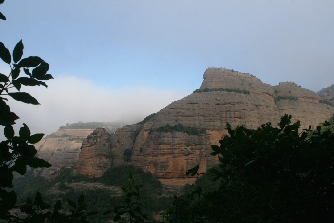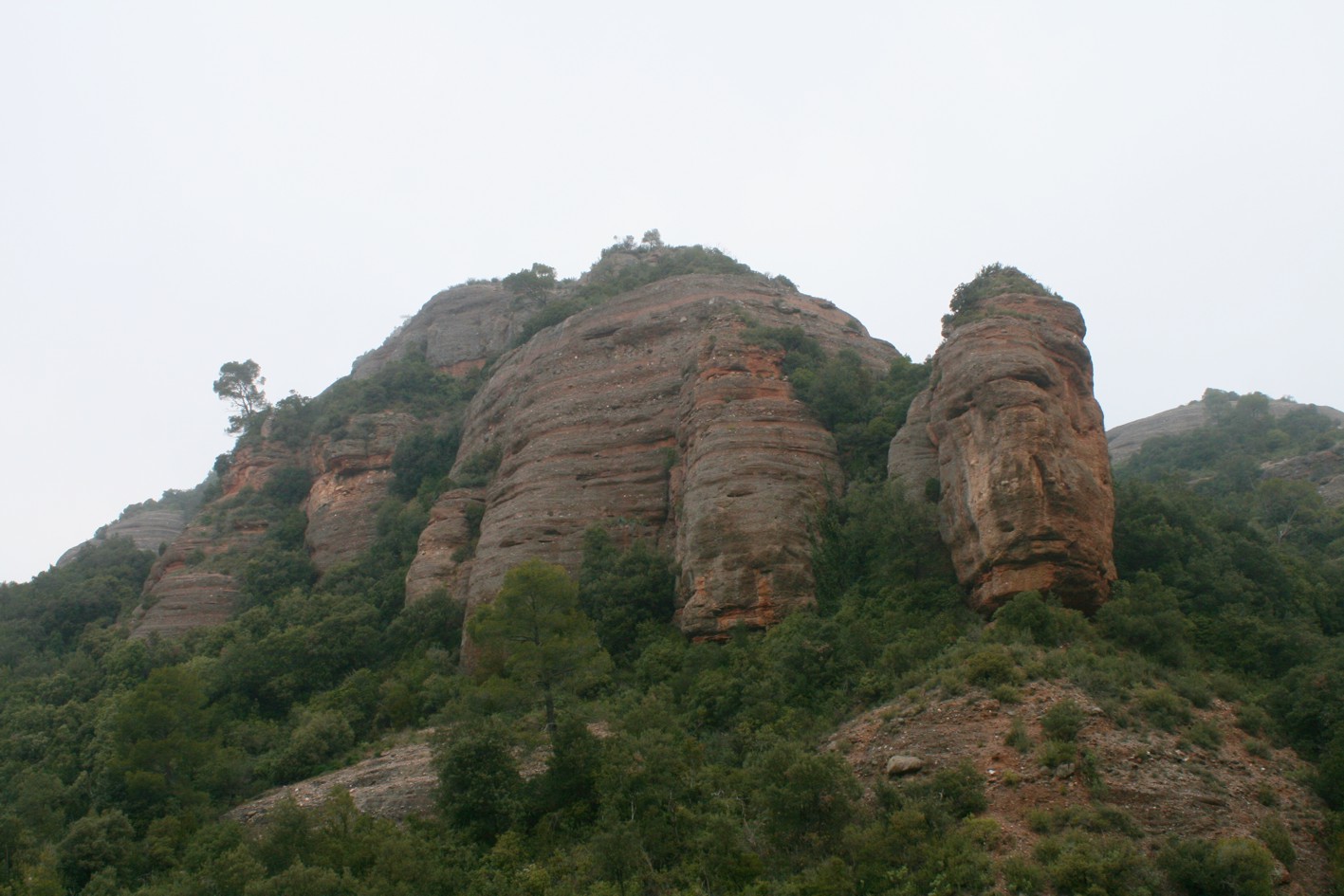 Roig i desprès cap a la font de la Portella. Aquí hem agafat el camí que surt de la part baixa de la font i que s’endinsa en un bosc ombrívol de boix i alzines i que planeja tot oferint unes extraordinàries vistes de la Roca Salvatge que ens queda sempre a la nostra esquerra. És important no agafar cap trencall. Indiquem que només sortir de la Portella ja en trobem un que baixa a la nostra esquerra i que porta a la Calsina i ja molt més endavant trobarem el principal, marcat amb padrons, en que el que hem de fer és agafar el de l’esquerra que planeja i no el de la dreta que puja i que és el que normalment tothom agafa.