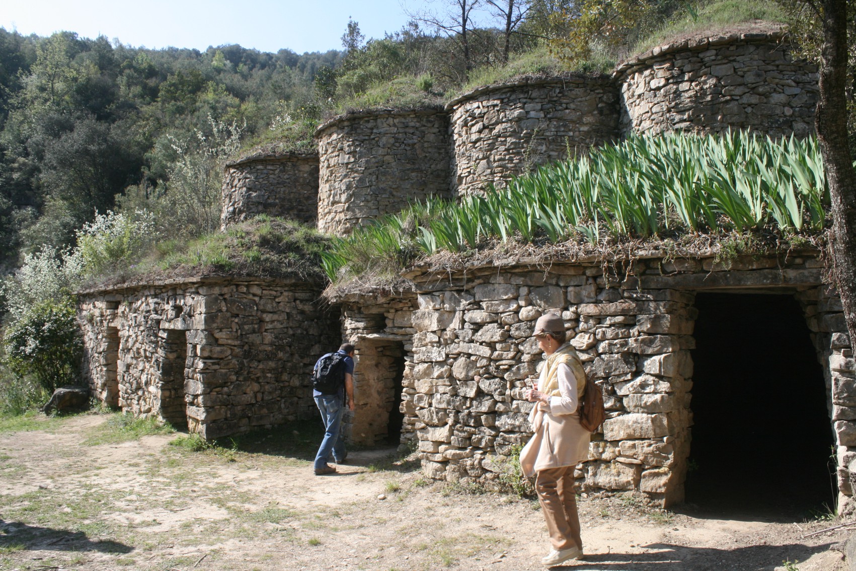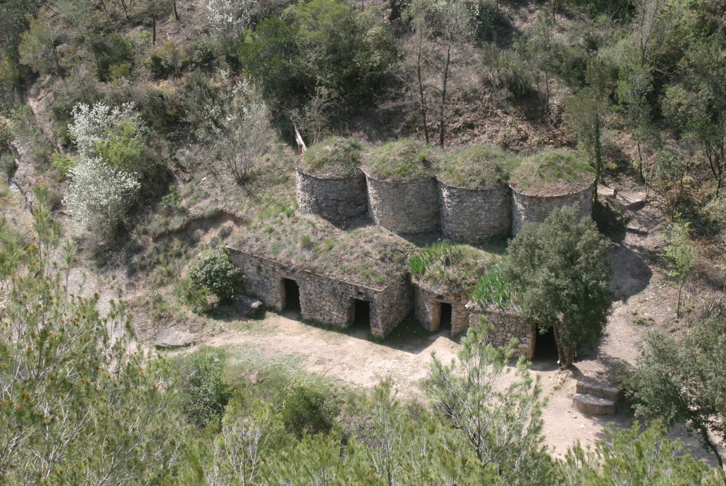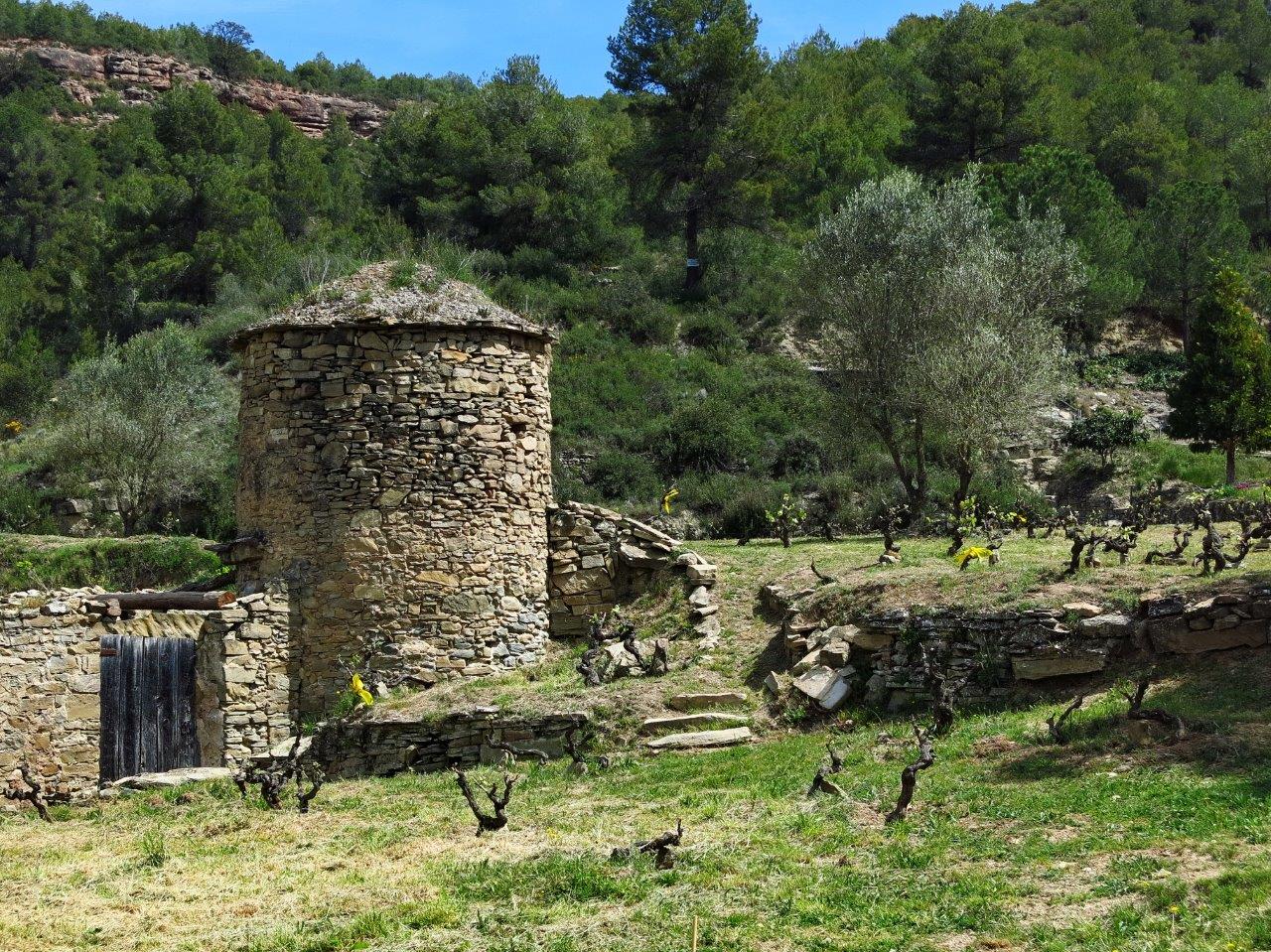 Continuem pel camí anterior que poc a poc es fa més estret a mesura que s’endinsa a l’obaga de la serra de Puig Gil. És una zona boscosa però que permet observar en l’altre vessant del torrent diverses barraques de vinya. El camí ressegueix vells marges de pedra seca i també es pot veure un dipòsit de vinya o xupet, que els pagesos utilitzaven bàsicament per elaborar el brou bordelès, una barreja de sulfat de coure i calç diluïts en aigua que prevenia les malalties dels ceps.