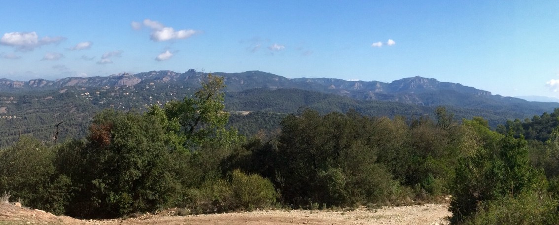 Desprès de visitar les runes hem tornat enrere per agafar el camí de pujada cap el Turó del Ros, on hi ha situada una antena de transmissions i un punt geodèsic amb unes boniques vistes de Montserrat per un cantó i de l’Obac i la Mola per l’altre. Des del Turó veiem que baixa una pista ample a mà esquerra que agafem per iniciar la baixada. De baixada trobem un trencall a l’esquerra que porta a la pedrera del Mimó però nosaltres seguim baixant fins que de nou trobem un trencall a l’esquerra que porta al Mas del Mimó.