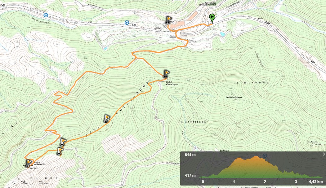 Nosaltres seguim per la pista que ara planeja i ens porta a la cruïlla que ja havíem trobat a la part inicial de l’excursió. Refem el camí del inici i arribem sense dificultats a la masia de CollCardús on fem una parada en els seus jardins abans de baixar a l’aparcament dels vehicles.