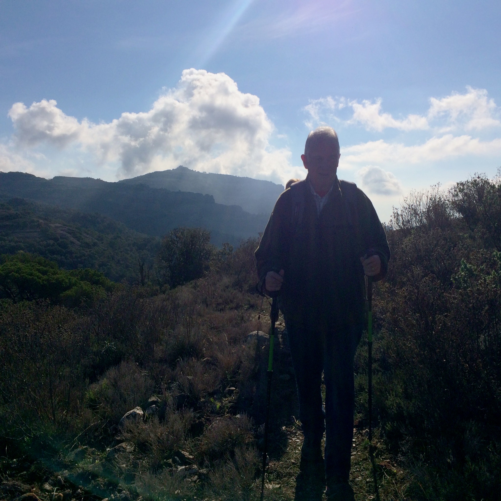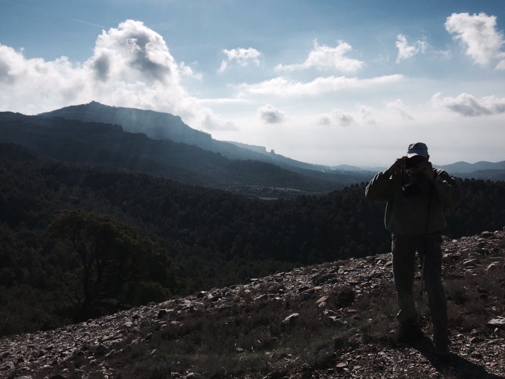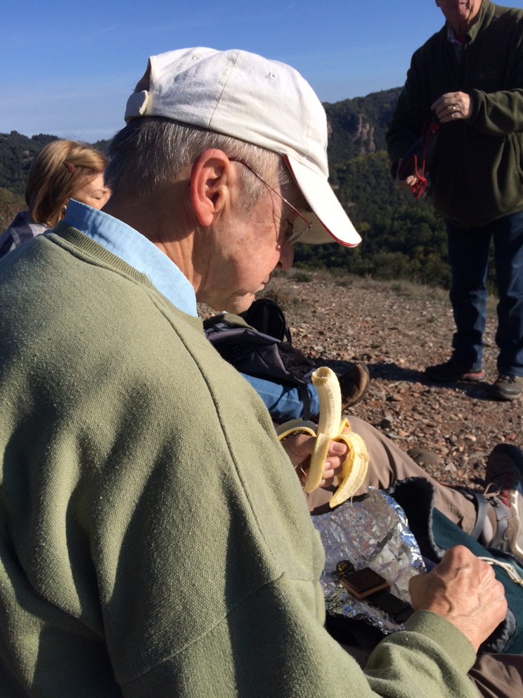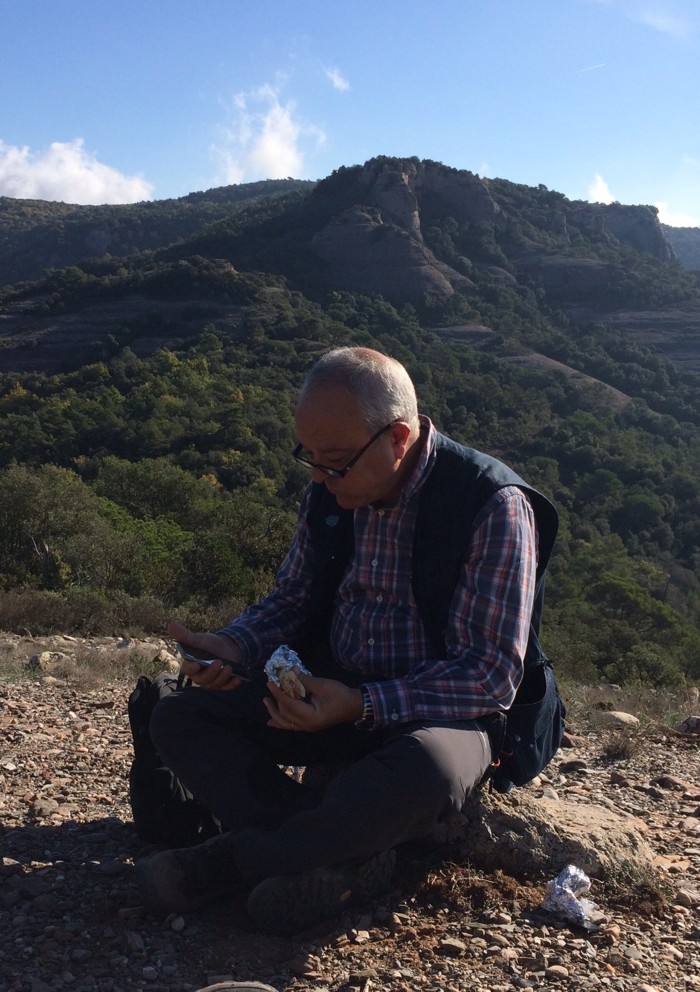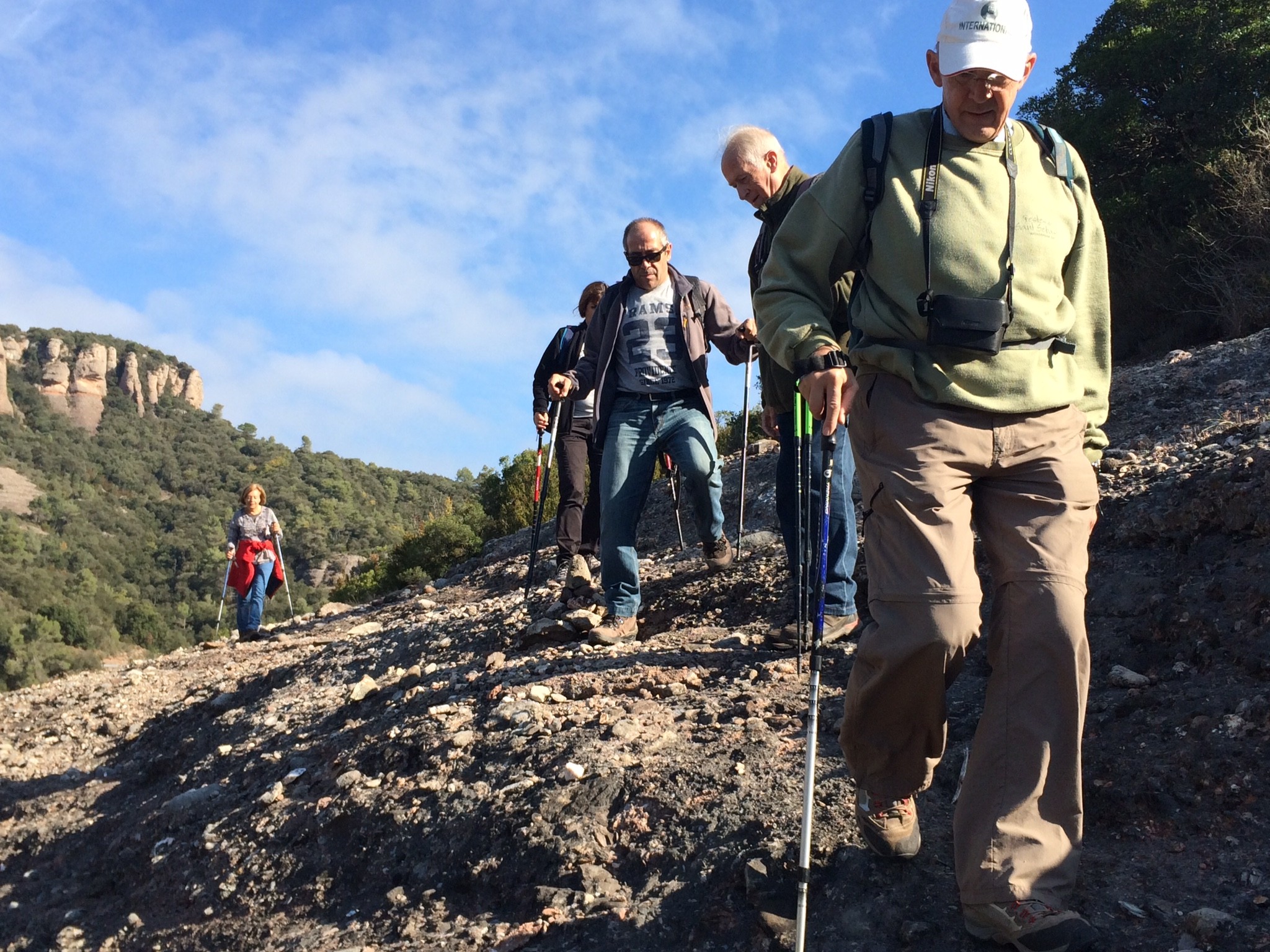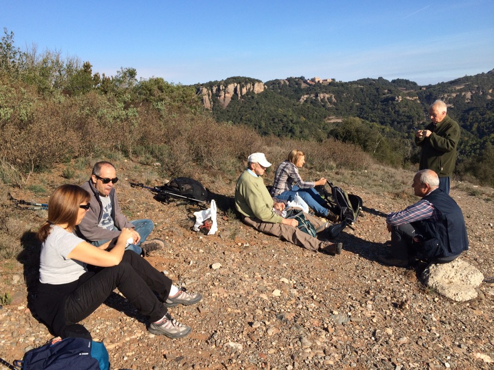 Pugem pel rocam i arribem al cim de Prunera de 888 metres d’alçada on parem per esmorzar. Desprès voltem el cim per la dreta fins trobar un camí que baixa i que passa primer per una zona boscosa d’alzines i boix i desprès pel mig del rocam intentant seguir els padrons que marquen la baixada.