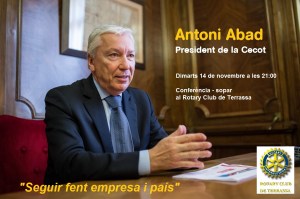 El proper dimarts 14 de novembre el Rotary Club de Terrassa té com a convidat al seu tradicional sopar amb conferència l’Antoni Abad, ex-soci del club i President de la Patronal CECOT.