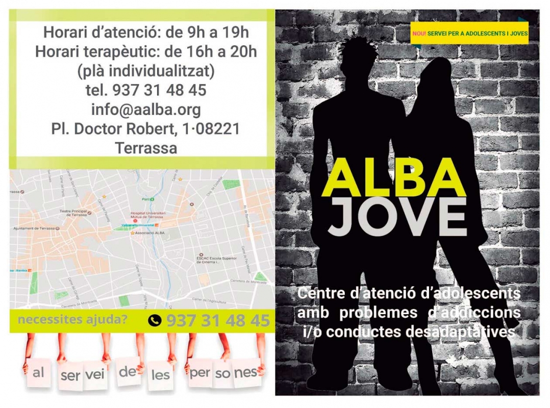 - El servei ALBA Jove promou el desenvolupament integral dels joves i adolescents en els àmbits personal, familiar, educatiu i social, buscant afavorir la seva maduresa i evolució personal i grupal. I cerca identificar el problema existencial que indueix a la persona a l’addicció i a treballar des d’un marc terapèutic-educatiu, per aconseguir que recuperi la seva autonomia, el seu sentit de la responsabilitat i la capacitat per prendre decisions i ser un membre actiu de la societat.