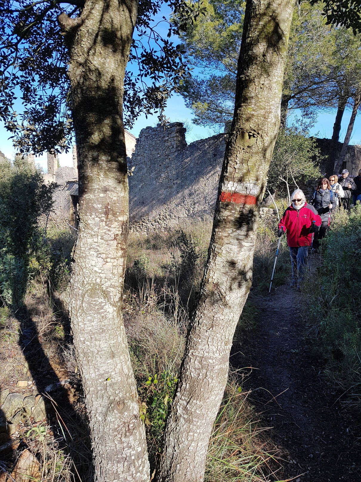 Un cop tips retornem a l’ermita per agafar un camí marcat amb un GR que baixa per una zona boscosa i un xic feréstega (cal vigilar perquè hi ha alguna baixada en que es pot relliscar) fins a trobar un encreuament marcat en que agafem el trencall que ens queda més a l’esquerra i que ens porta al trencall que abans ja havíem indicat quan pujàvem, prop de ca l’Ambròs.