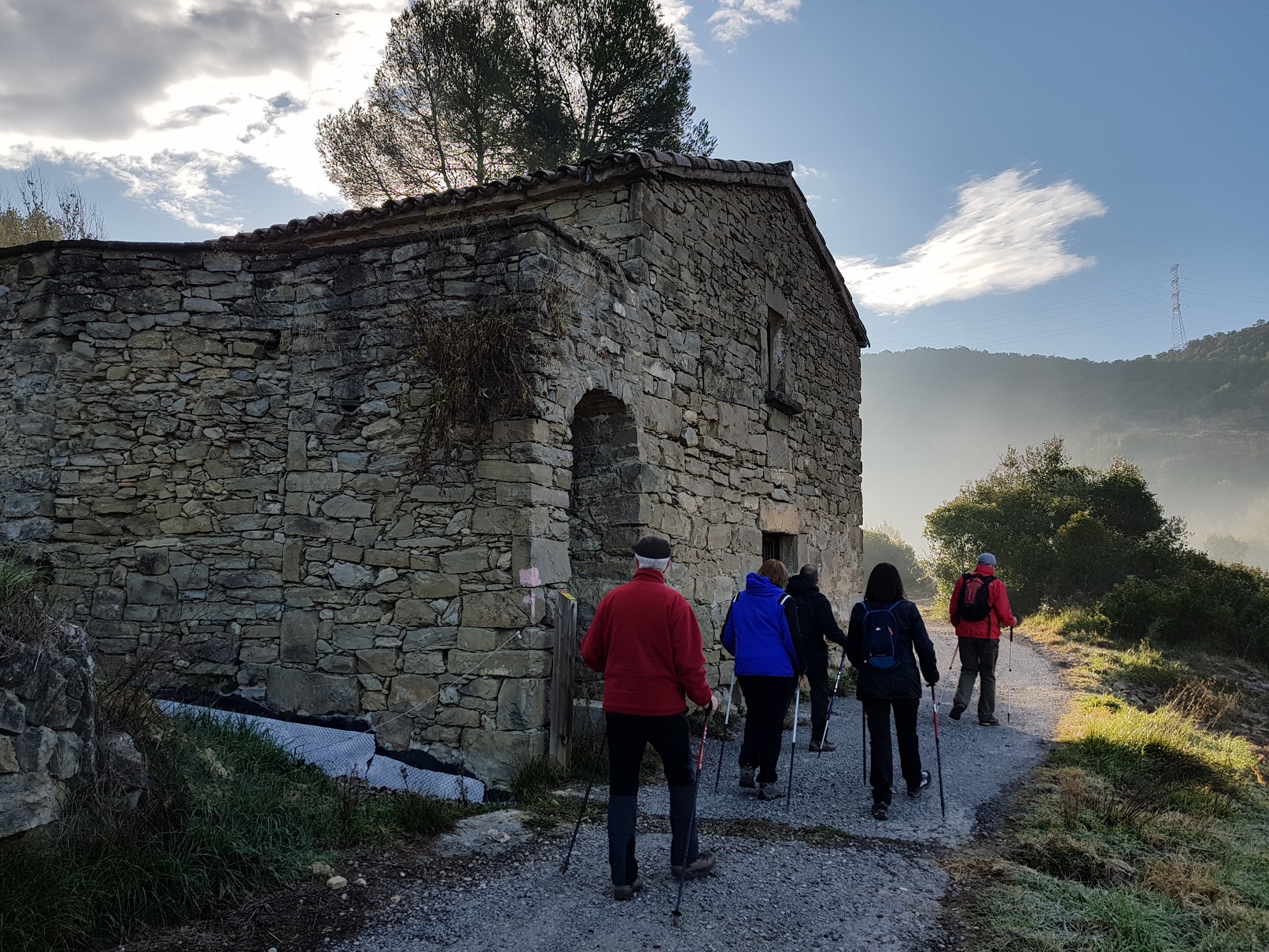 rem. Ara nosaltres seguim la pista ample que trobem a la dreta i que puja suau. Més endavant cal estar atents a un trencall a mà esquerra que s’enfila pel costat d’un camp conreat. Seguim el camí sense desviar-nos i desprès d’unes giragonses amb forta pujada arribem, a enllaçar amb el camí Ral de Manresa a Barcelona i protegit per murs de pedra seca.