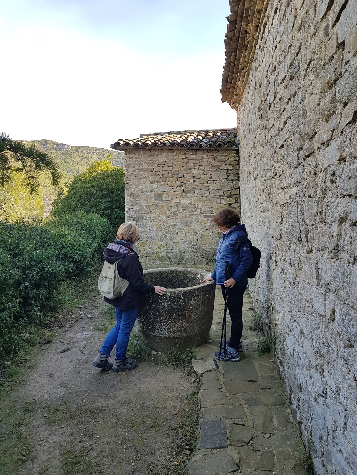 Nosaltres el seguim a mà esquerra i desprès de deixar a la nostra esquerra el cim de la Roca de Sant Jaume arribem a l’església de Sant Jaume de Vallhonesta. La visitem per fora i agafem un caminet que surt del seu darrera per pujar fins a la propera font de Sant Jaume que trobem seca.
