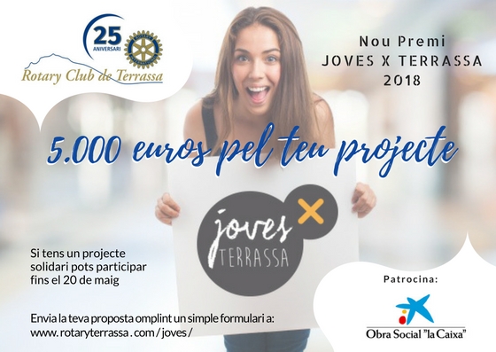 El Rotary Club de Terrassa ha obert el termini de participació de projectes al Premi Joves x Terrassa fins el 20 de maig de 2018 i gràcies al nou patrocinador que des d’aquest any s’incorpora al Premi, l’Obra Social “La Caixa”, la quantitat s’amplia fins els 5.000 €