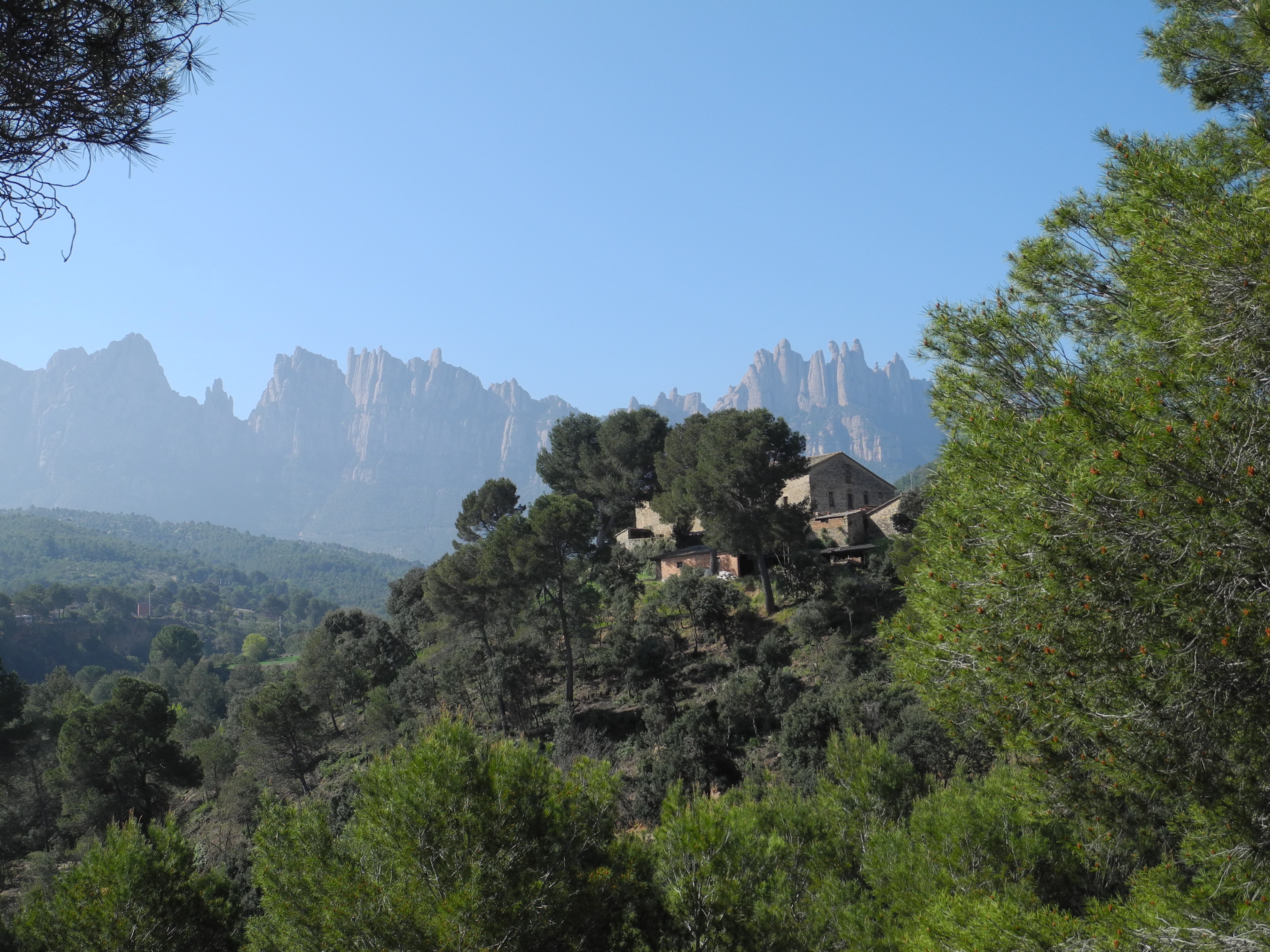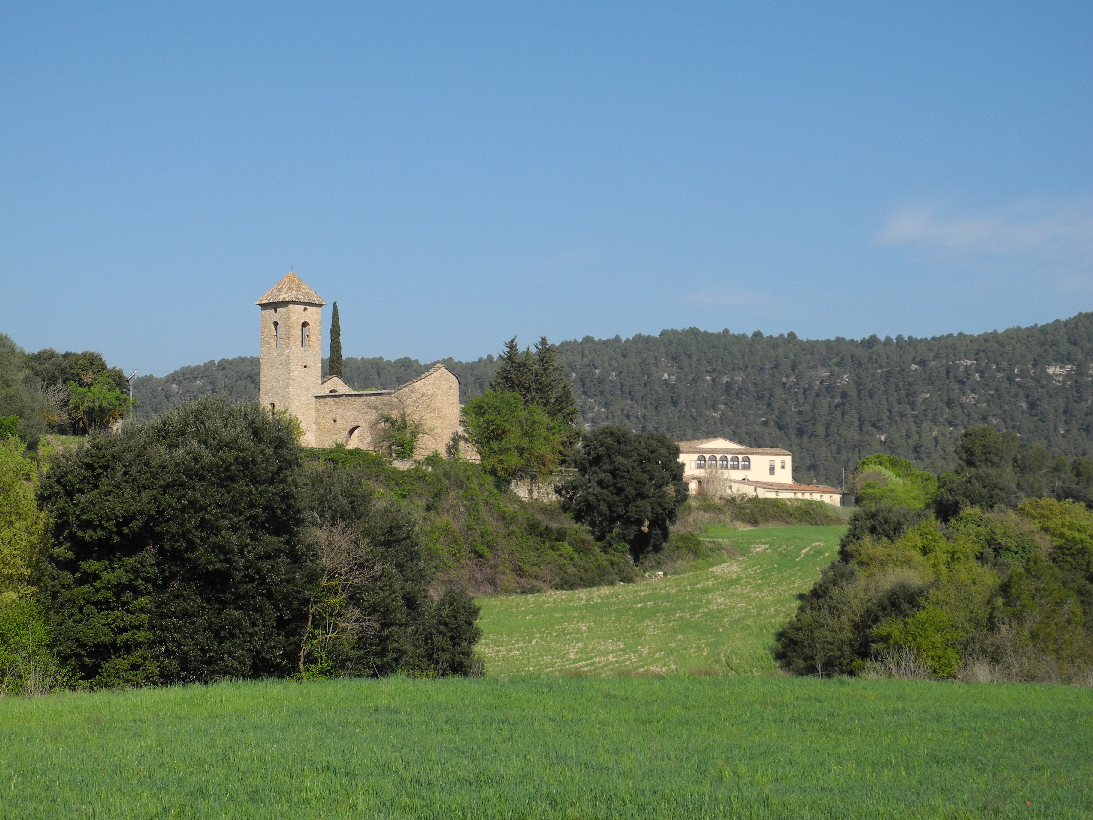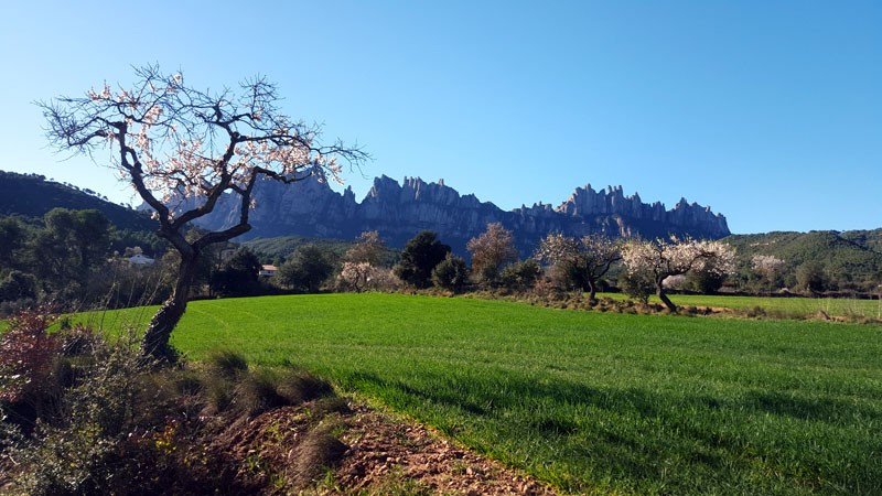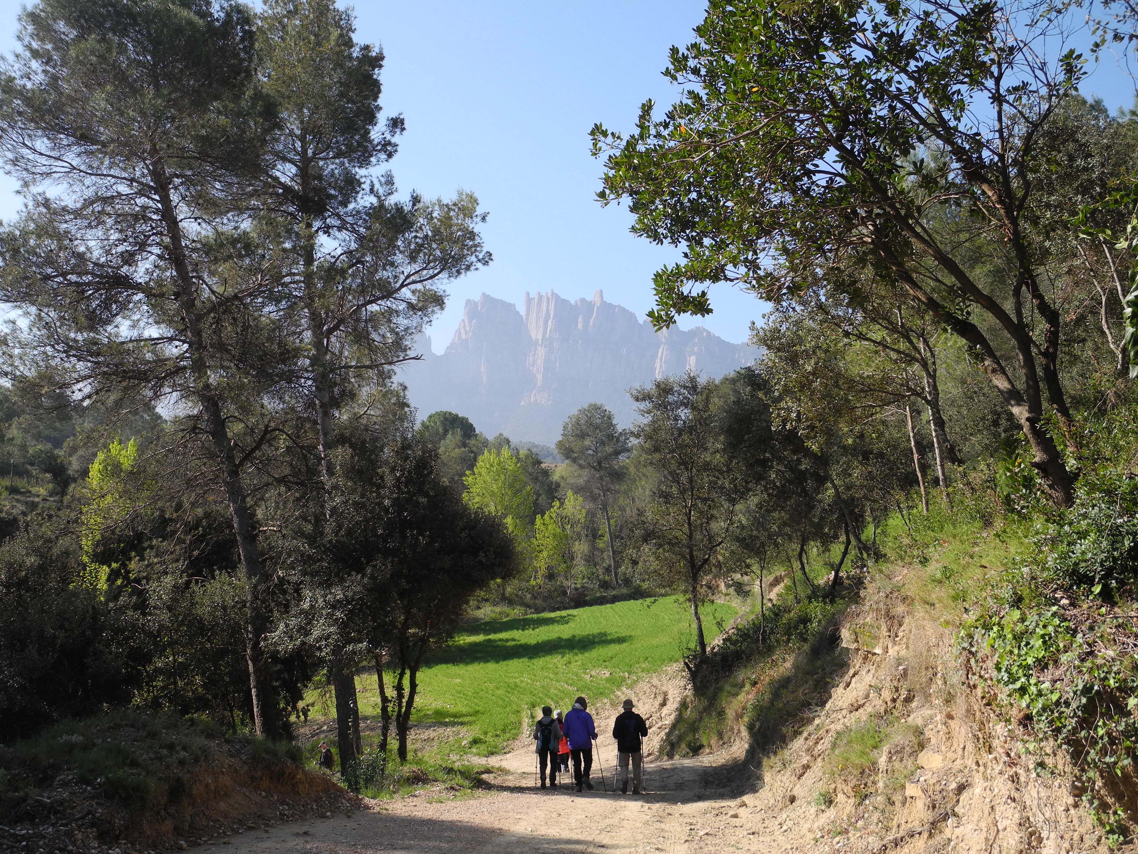 Sortint de l’església hem agafat un camí de terra que surt a mà esquerra i que s’endinsa cap a una zona de bonics camps cultivats i on les vistes de les agulles de Montserrat ens deixen bocabadats. El camí et porta a un de més ample que cal agafar a mà esquerra i que continua fins arribar prop d’una casa de pagès a la que no cal arribar ja que ens desviem per un trencall a mà esquerra que ràpidament baixa cap a la riera del Carner.