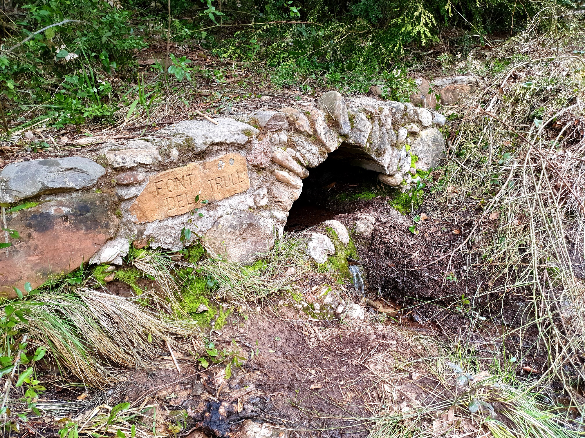 Després hem tornat enrere fins al trencall d’abans. Aquí hem agafat el camí que travessa la riera de Rellinars i en una nova cruïlla amb 2 camins hem agafat el que ens quedava més a l’esquerra i que segueix la riera per la seva banda dreta. Uns passos més endavant ens hem desviat un moment per un caminet estret que porta deseguida a la font del Trull, just a l’altra banda de la riera.