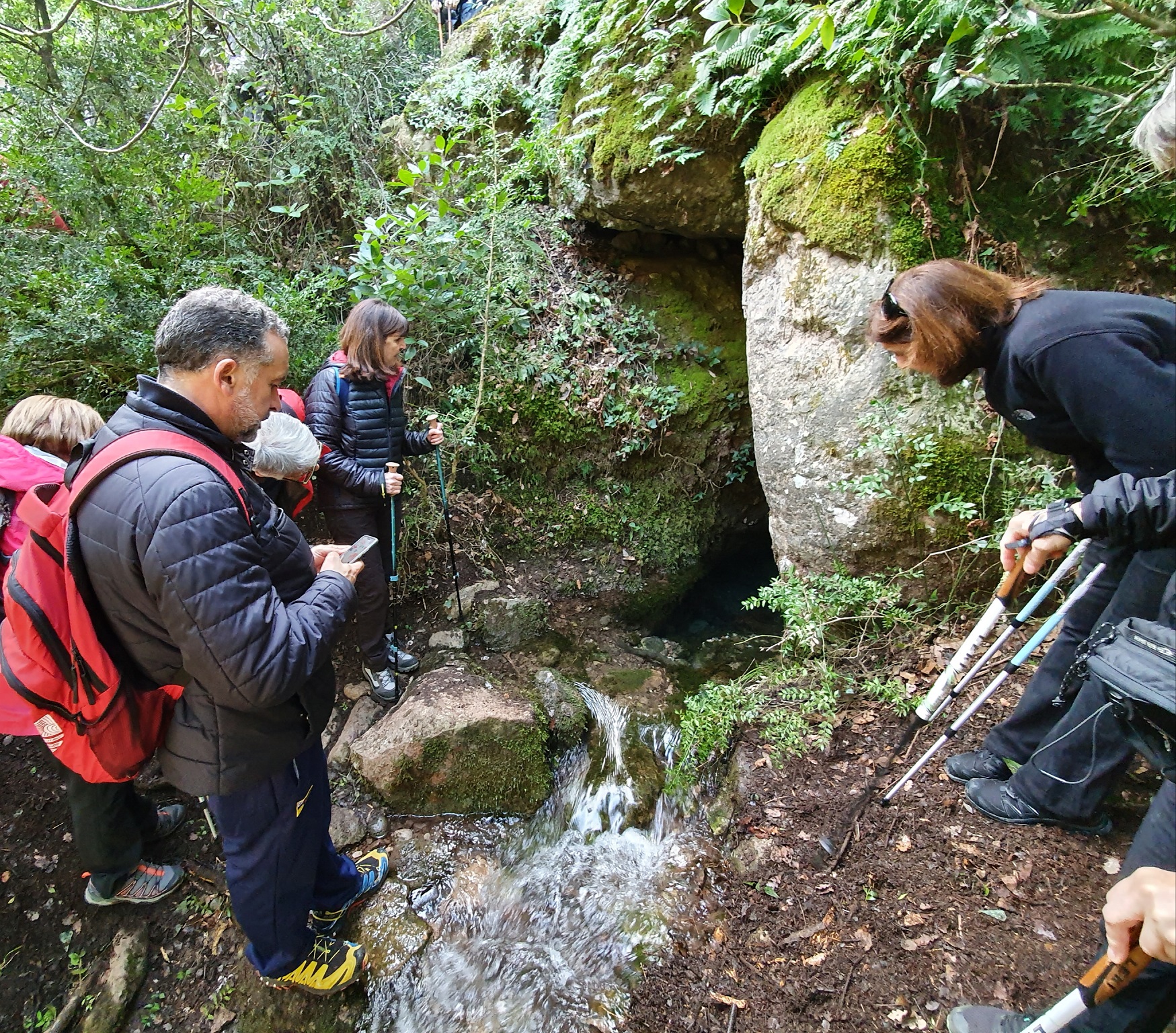 Un cop tips hem continuat pujant per la pista fins a trobar a mà esquerra una fita que marca l’inici d’un caminet que baixa fins a la Saiola, una nova surgència d’aigua que surt del subsol i alimenta la riera.