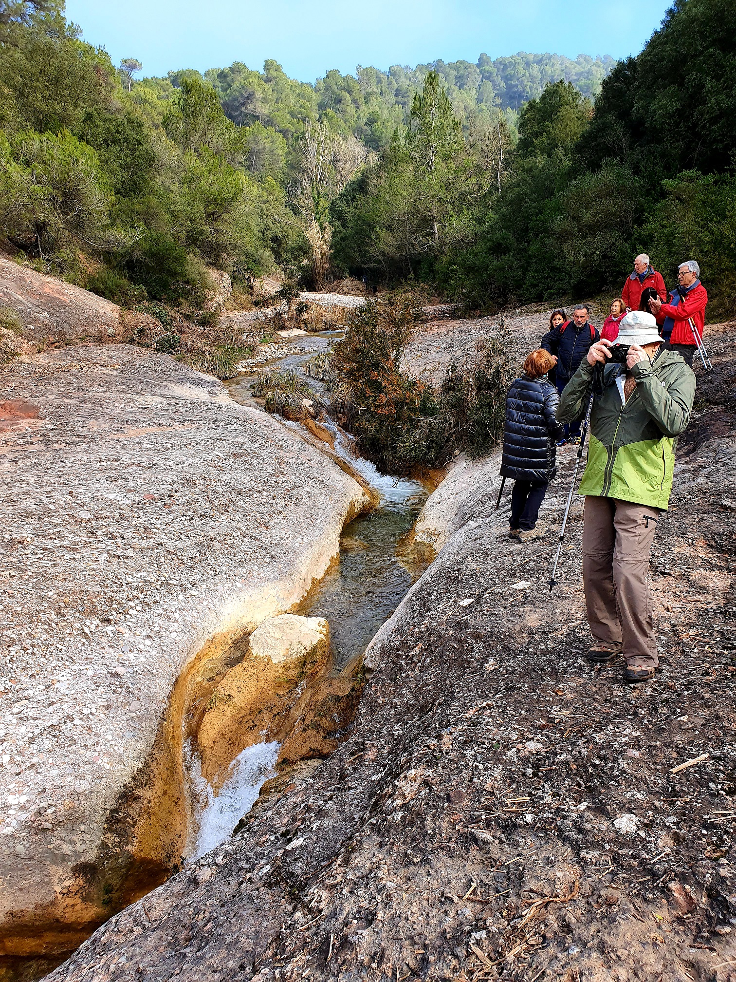 Retornem a la pista i seguim forçà estona aquest camí en pujada amb la riera sempre a la nostra esquerra fins que em vist al mig de la riera unes grans roques en les que ens em aturat per esmorçar.