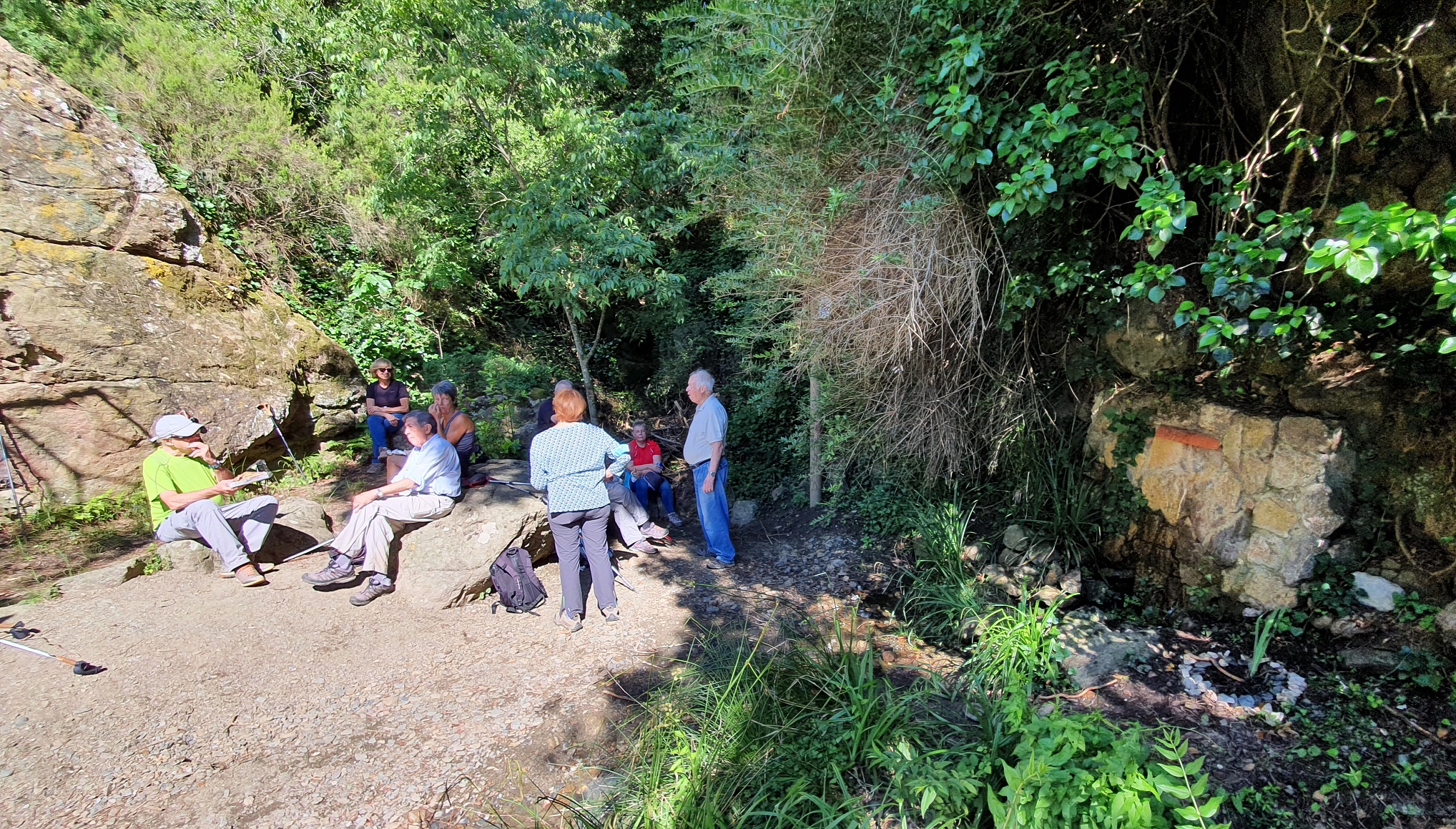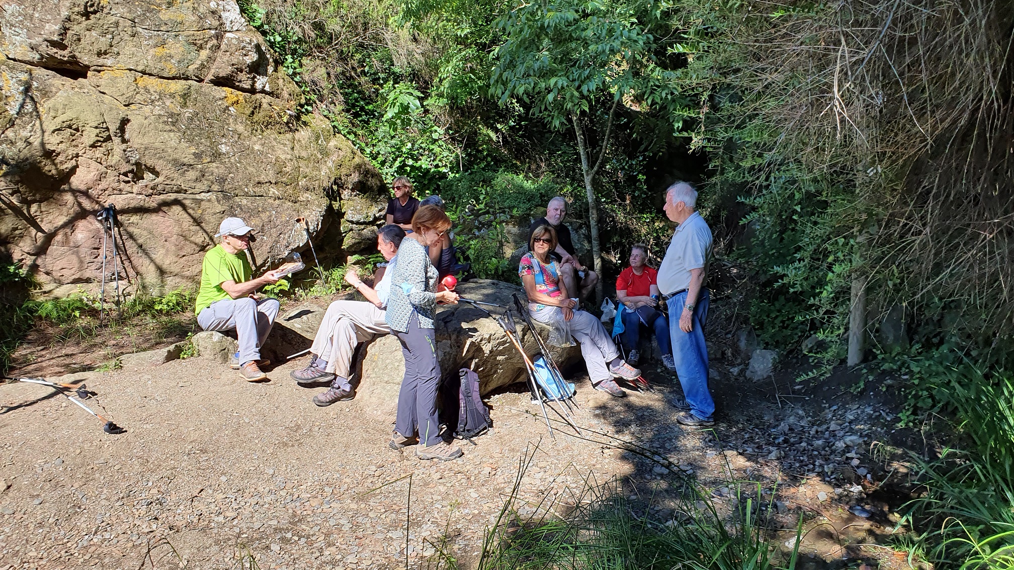 Nosaltres hi hem esmorzat tot escoltant el soroll del torrent que baixa escolant-se per les pedres. Desprès hem tornat per on hem vingut fins al trencall que abans hem esmentat tot baixant pel camí que queda més a l’esquerra. El camí baixa per un bosc ombrívol fins arribar a una pista ample que hem agafat a l’esquerra.