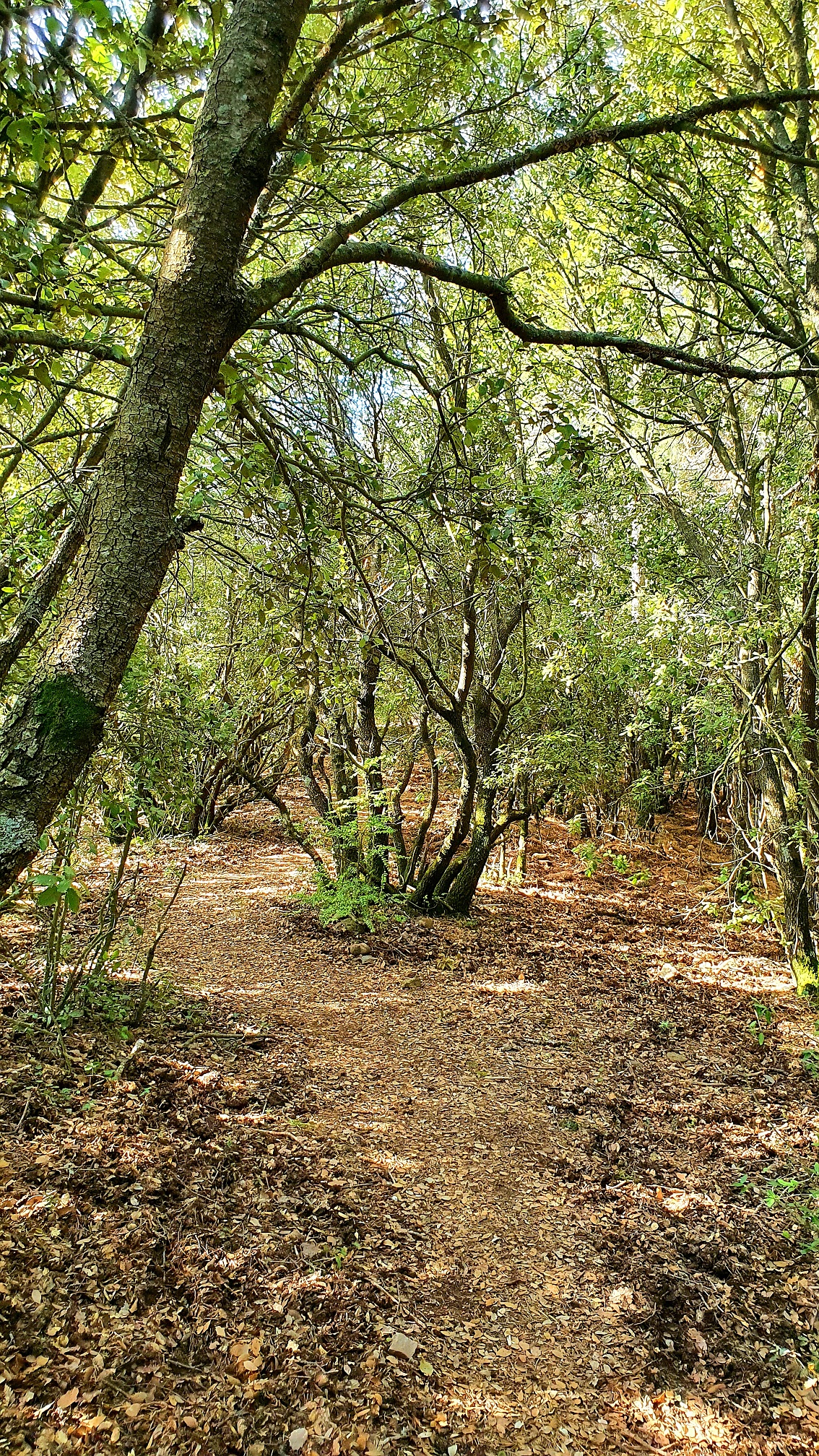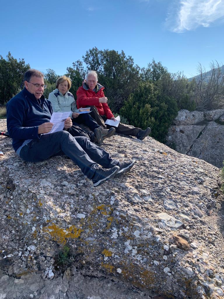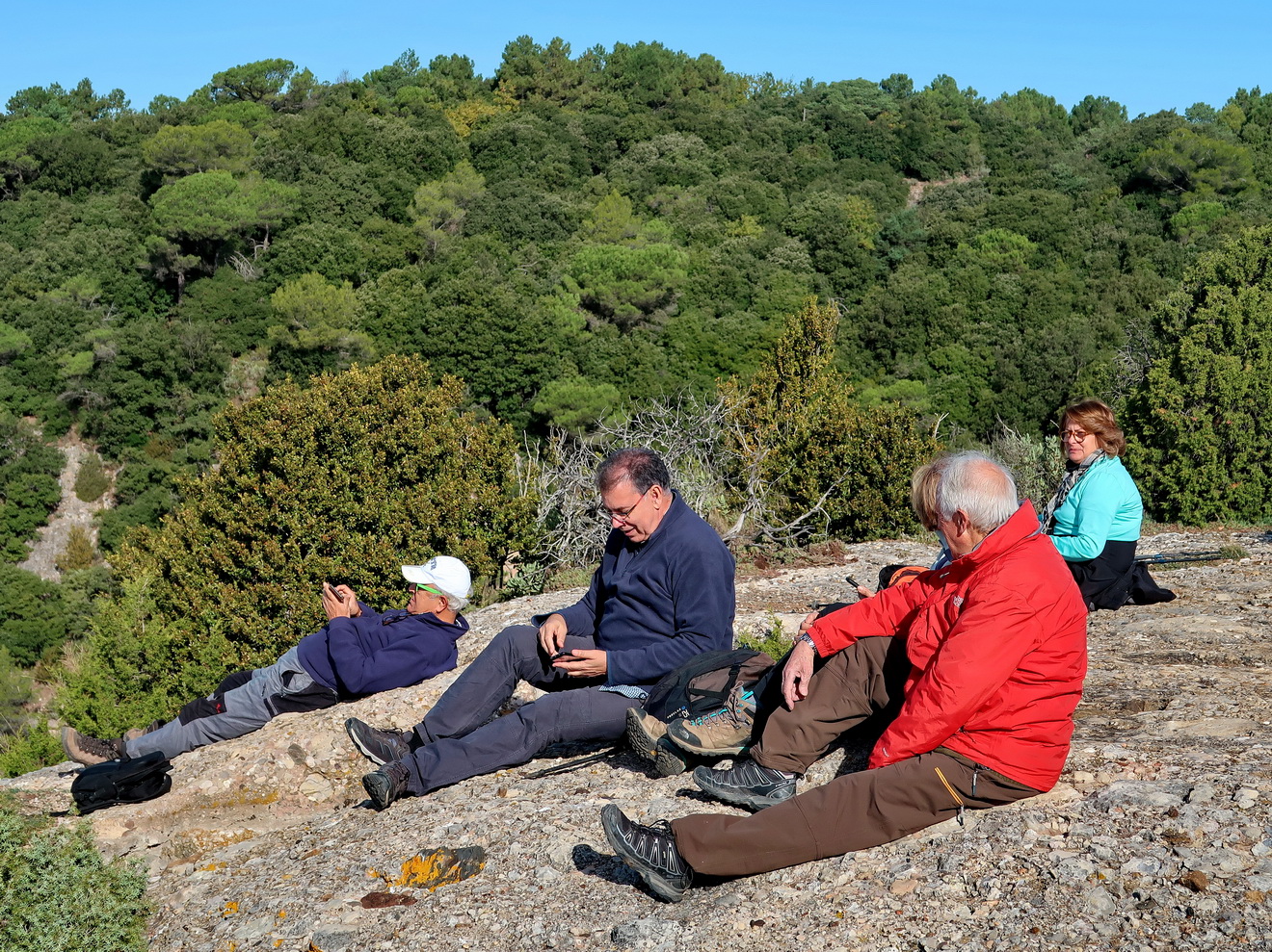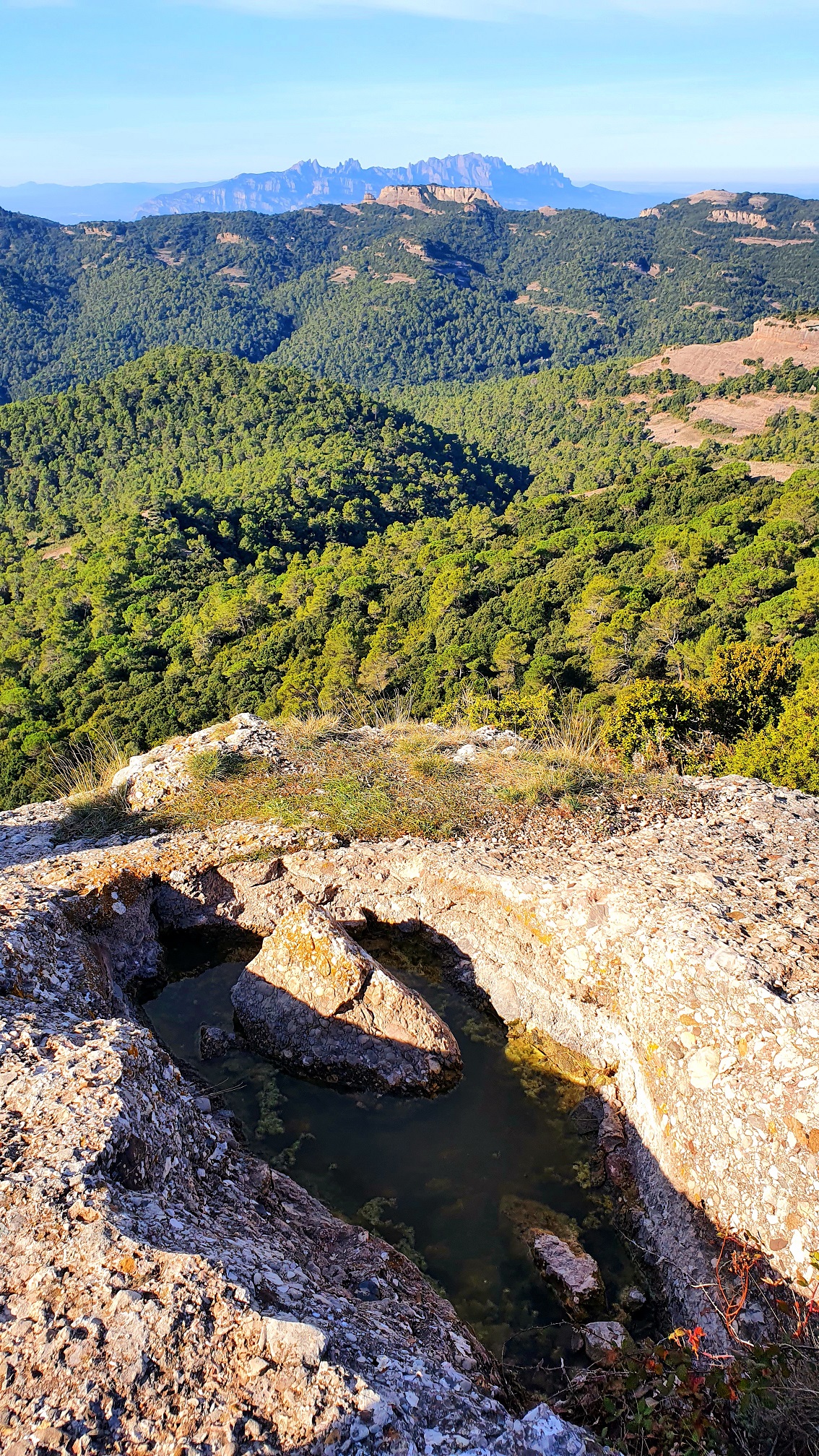 Aquí hem pogut observar que la petita bassa que hi ha encara tenia aigua i hem esmorzat tot gaudint del paisatge. Al finalitzar hem tornat enrere fins al punt de la carena on havíem pujat i em continuat pel camí carener fins arribar al Coll de Ginebres dins d’un bosc d’alzina molt bonic. Una mica més endavant arribem a tocar de les roques del Morral d’en Bens i cerquem a mà dreta el camí que baixa de sobte per una zona molt ombrívola.