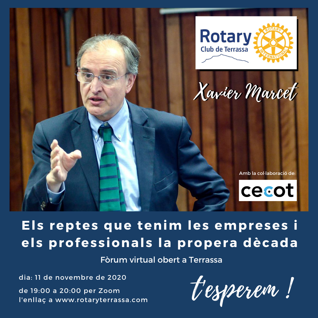 En aquest sentit ha decidit organitzar un Fòrum amb en Xavier Marcet, consultor en estratègia, innovació i emprenedoria corporativa, llicenciat en història per la UAB i amb postgraus a escoles de negocis de UC Berkeley, IESE i ESADE.