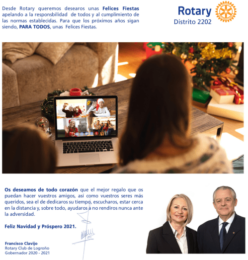 Amb motiu de les Festes de Nadal i Any Nou, us adjuntem la felicitació que ens ha fet arribar el governador del Districte 2202 al que pertany el nostre Club Rotary de Terrassa, el Sr. Francisco Clavijo, i la seva esposa Marian.