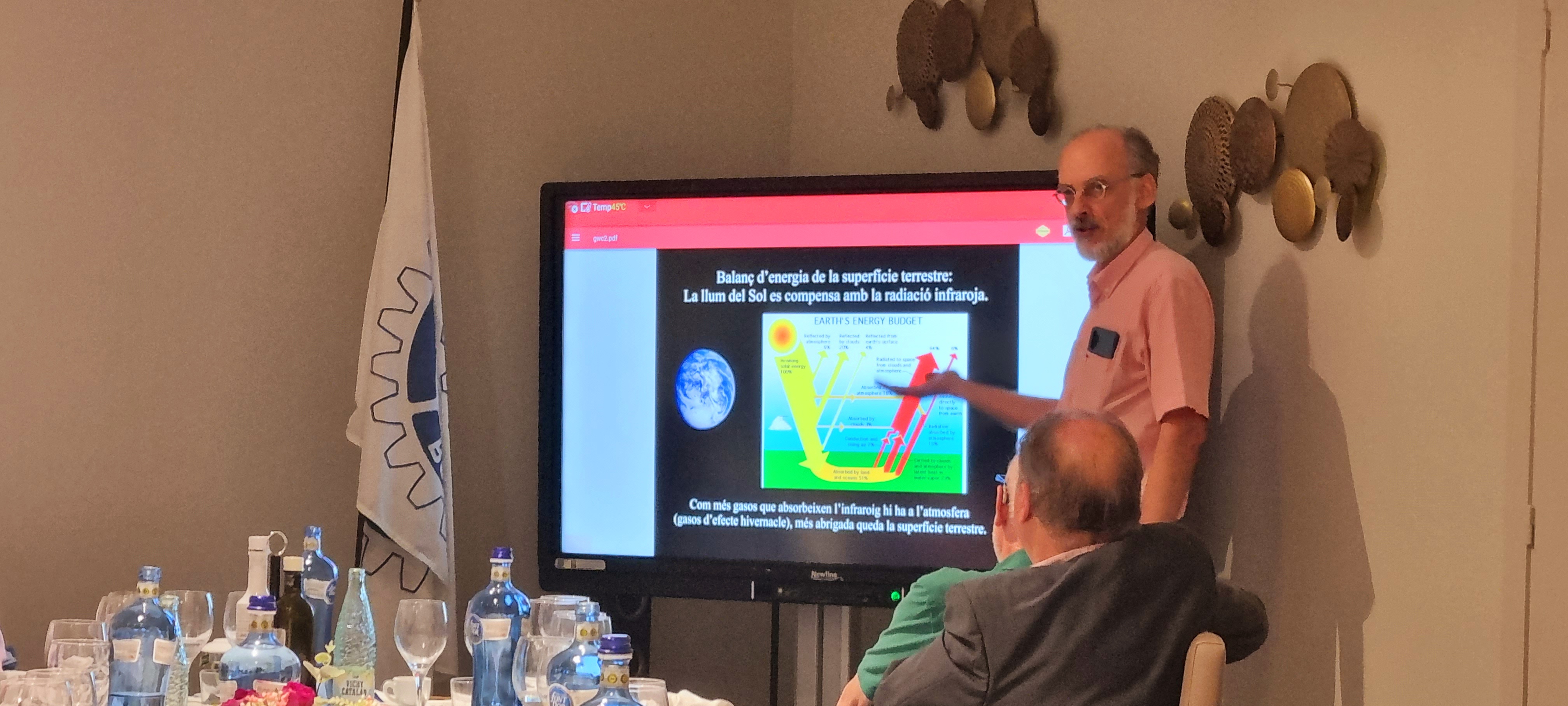 A començat la seva intervenció parlant del important balanç d’energia de la superfície terrestre i de com la llum del Sol es compensa amb la radiació infraroja, de manera que com més gasos hi hagi que absorbeixin l’infraroig a l’atmosfera (gasos d’efecte hivernacle), més abrigada quedarà la superfície terrestre.