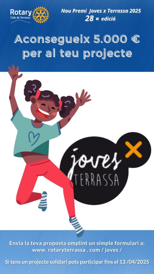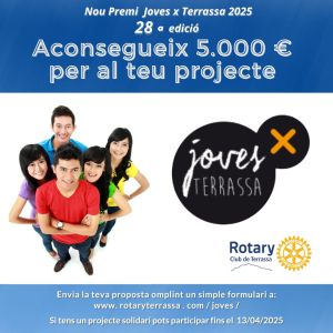 Rotary Club de Terrassa vol destacar la importància que té el XXVIII Premi Joves per Terrassa a la nostra ciutat, ja que és un del premis més importants que es dona a entitats que treballen en accions solidàries, des de la perspectiva de donar ajut i suport als projectes de joves compromesos en finalitats socials.