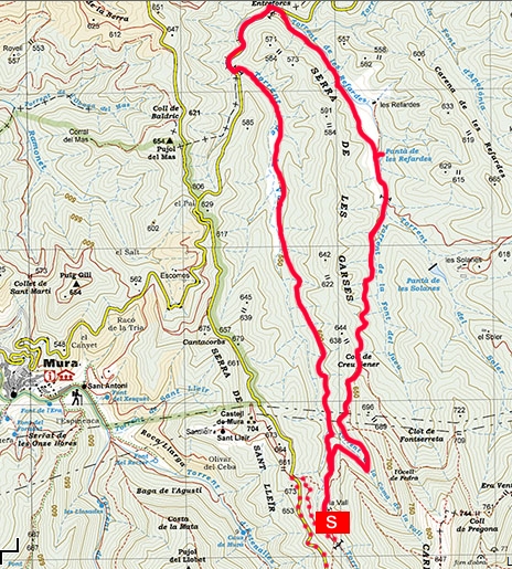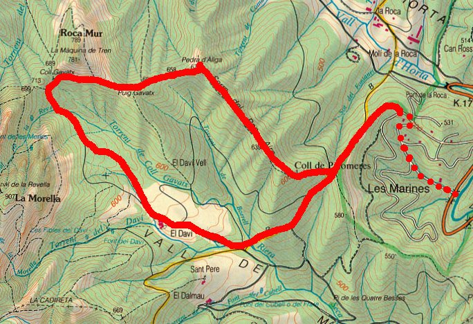 6.- (26 de febrer) ROCA MUR.- Urb. Las Marines.(Km.16,3 Carretera de Castellar a San Llorenç).-Coll de Palomeres.- Riera Seca.- El Daví.- Coll de Gavatx.- Roca Mur (opcional, depèn del temps que tinguem).-Puig Gavatx.- Pedra de l’Àguila.- Serra del Bon Aire.-Coll de Palomeres.- Las Marines. Link excursió