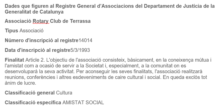 El mail del ROTARY CLUB TERRASSA per gestionar les dades personals és rotaryterrassa@gmail.com