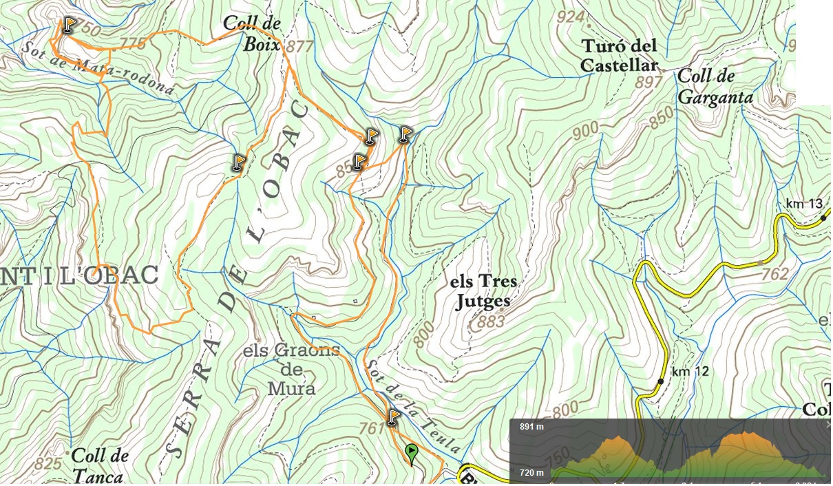 Ruta: Alzina del Sal.lari – Sot de la Teula – Els Graons de Mura – Coll de Boix – Agulles de Mata-Rodona – Agulla Gran – Sot de Mata-Rodona – Coll de la Cort Fosca – Cingle del Forat – carena del GR5 – Coll de Boix – Font dels Traginers – Alzina dels Sal.lari / Distancia: 6,8 Km / Desnivell: 330 m.