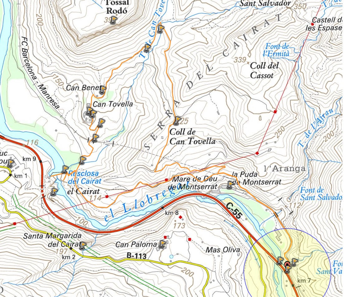 Ruta: Aparcament Km.7 de la C-55 – Runes del balneari de La Puda – camí de can Tobella – Resclosa del Cairat – El Llobregat – Torrent de can Tobella – Masia de can Tobella – Font del Pastor – can Benet – Balma de pedra tosca can Tobella – coll de can Tobella – La Puda – Aparcament Km.7 de la C-55