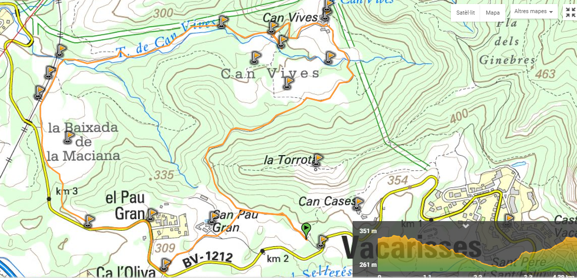 - Ruta: Vacarisses – Km 1,7 de la BV1212 – Boscos de can Vives – Masia de Can Vives – Torrent de can Vives – Pont del tren – la baixada de la Maciana – BV1212 – El Pau Gran – Can Pau Gran – Km 1,7 de la BV1212 – Vacarisses