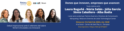 Des del Fòrum Cecot i el Rotary Club de Terrassa et convidem a un debat únic i inspirador amb referents del talent femení vinculades a la innovació. Dones que impulsen transformació en organitzacions, projectes i ecosistemes, i que compartiran com converteixen idees en impacte, com prenen decisions en contextos incerts i quines claus ajuden a construir avantatge competitiu a través de la innovació.