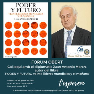 El dimarts 28 de gener a les 8:45 hores, a la seu del Rotary Club de Terrassa de l’Hotel Don Cándido, es farà un Fòrum Obert del Rotary de Terrassa. Et títol de la conferència és: Col·loqui amb el diplomàtic Juan Antonio March autor del llibre PODER Y FUTURO veinte líderes mundiales y el mañana